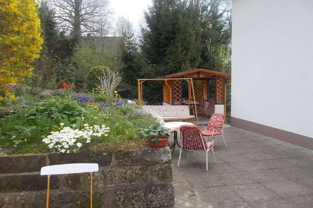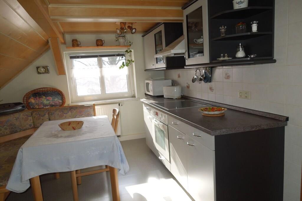 In der 2. Etage: (Wohnzimmer(, , Bibliothek, TV, Radio), Küche(, , , Kochnische, Esstisch, Herd, Kochplatte, Wasserkocher, Toaster, Kaffeemaschine, Mikrowelle, Spülmaschine, Kühlschrank, Tiefkühlschrank)) Dachgeschoss: (Badezimmer(, Toilette, Badewanne, Dusche, Waschbecken)) Schlafzimmer(, Doppelbett), Schlafzimmer(, Doppelbett), Internet, Internet, Garten, Gartenmöbel