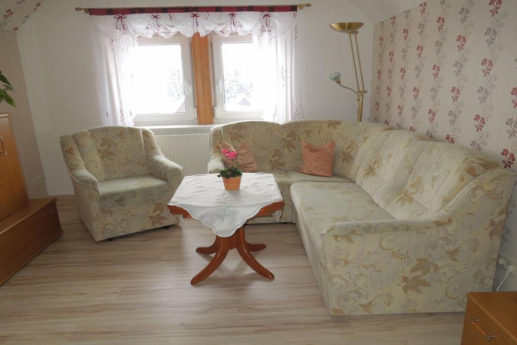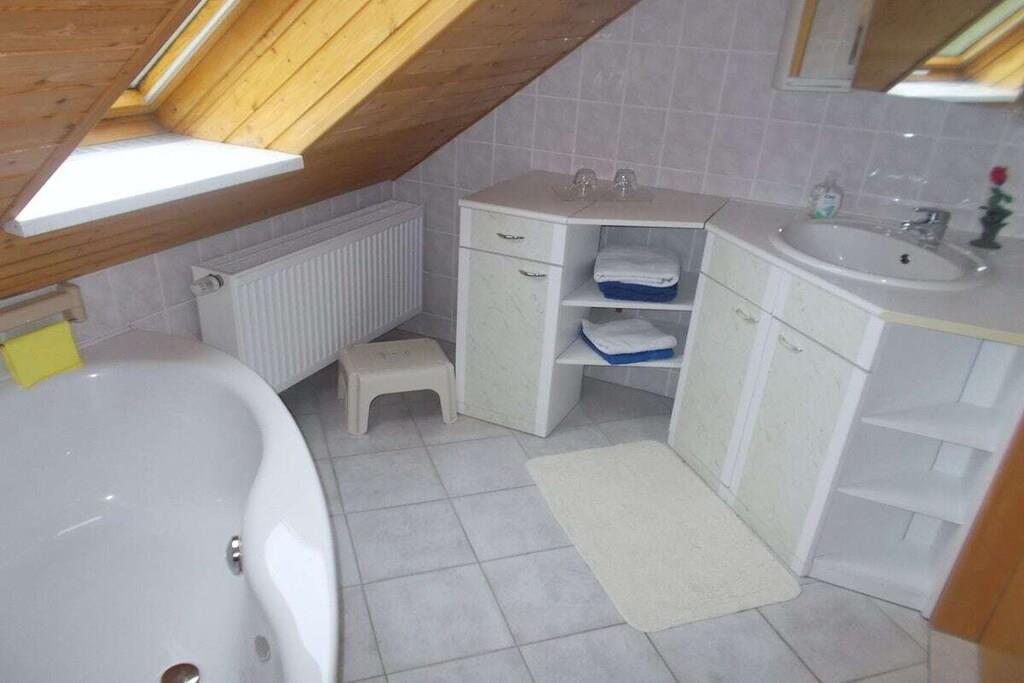 Schöne Ferienwohnung in Deutschland (Elbsandsteingebirge): Bis zu 4 Gäste finden hier auf 60m² Platz, mit Terrasse und Pool sowie WLAN kostenlos. Die Unterkunft bietet ein geräumiges Wohnzimmer und 2 separate Schlafzimmer. Bad mit Eckbadewanne.