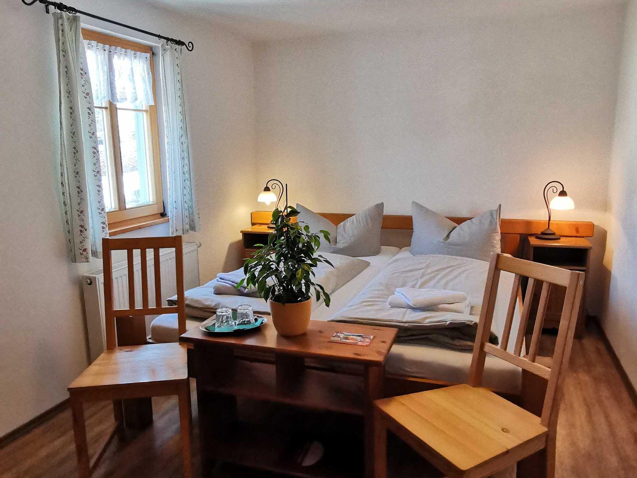 Familienzimmer mit 2 Schlafräumen und Bad. Ein Schlafzimmer mit Doppelbett und das zweite Schlafzimmer mit massiven Etagenbett. Beide Zimmer mit TV. Inkl. Frühstück