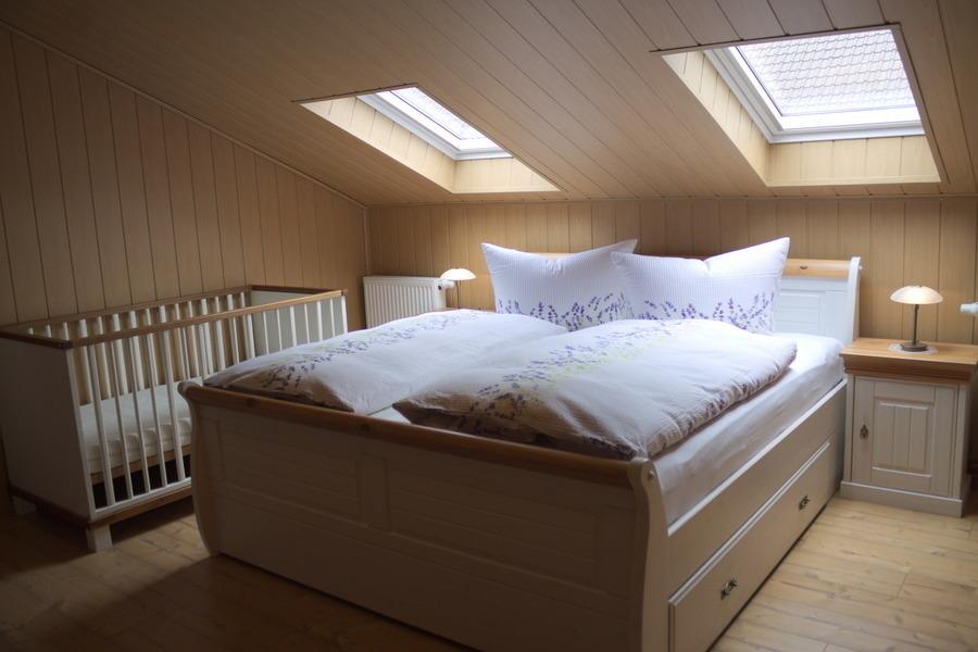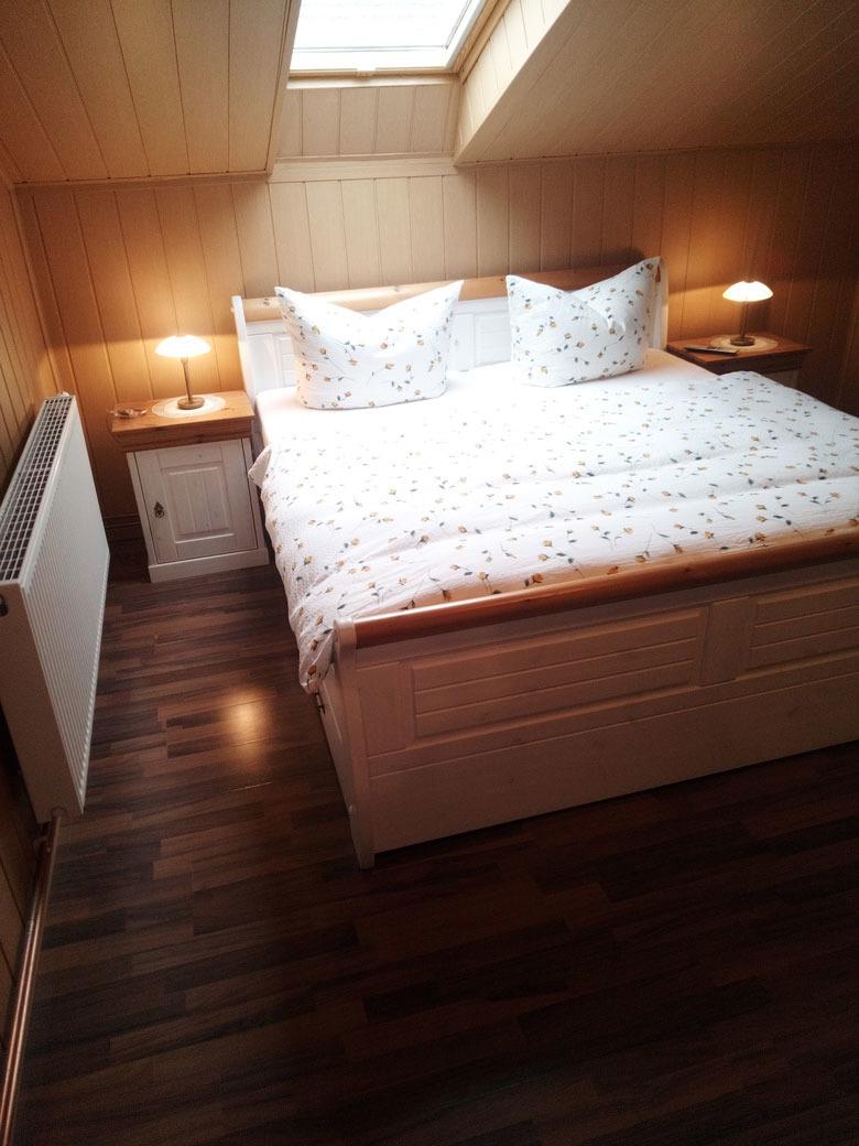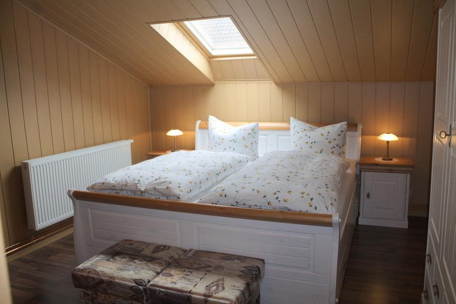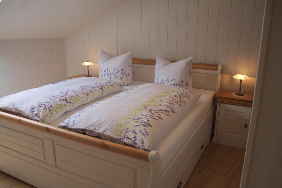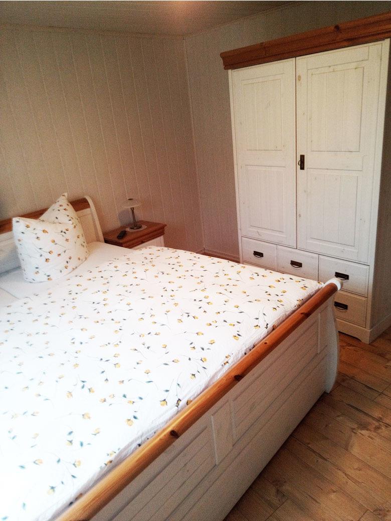 Von der Küche aus gehen Sie in das erste Schlafzimmer (Kranichnest) mit einem Doppelbett und einem Kleiderschrank, sowie einem Fernsehgerät. Zu diesem Schlafzimmer gehört ein eigenes Badezimmer mit einer Dusche, dem WC und einem Waschbecken.