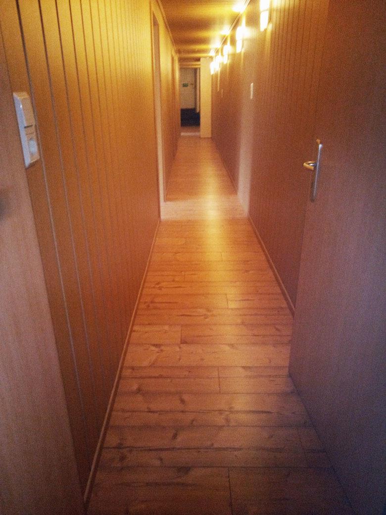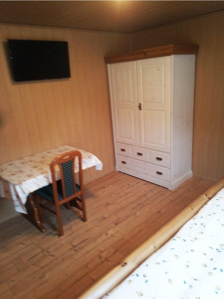 Von der Küche aus geht es in den Flur zu den anderen drei Schlafzimmern, die auch jeweils mit einem Doppelbett, einem Kleiderschrank und einem Fernseher möbliert sind. In einem Schlafzimmer (Adlerhorst) steht zusätzlich ein Gitterbettchen für Babys oder Kleinkinder (0-4 Jahre).