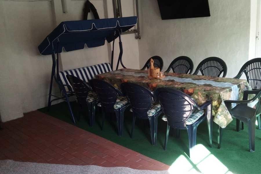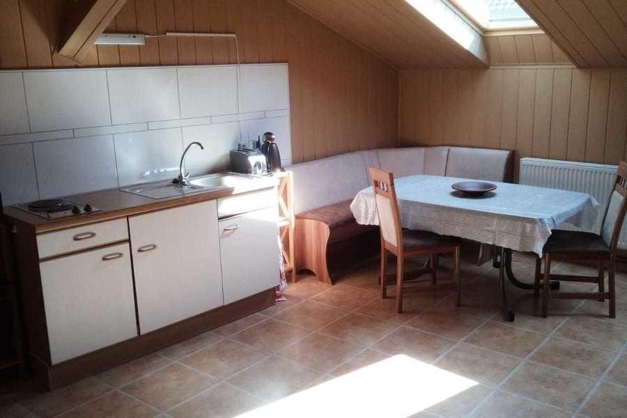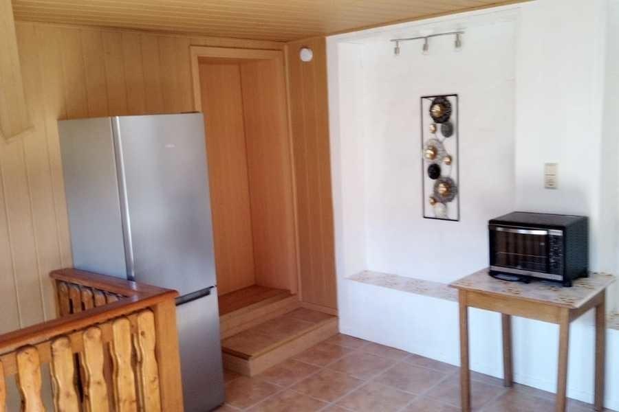 Sie betreten die Wohnung ebenerdig in einem Vorraum. Hier gibt es einen Esstisch mit Gartenstühlen und eine Hollywoodschaukel. Die Treppe führt ins Obergeschoß mit allen weiteren Räumen. Die große Küche ist mit einem Backofen, 2 Kochplatten, einem Spülbecken, einem Kühlschrank, einer Kühl- und Gefrierkombination, einer Kaffeemaschine, einem Toaster und einem Wasserkocher ausgestattet. Auch hier gibt es einen Esstisch mit einer Eckbank und Stühlen.