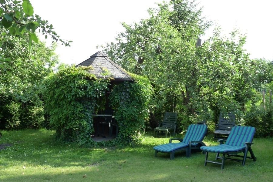 Vor dem Haus ist Ihre Terrasse mit Gartenmöbeln und Hollywoodschaukel. Im Garten gibt es einen Pavillon mit Tisch und Stühlen, der auch von den Gästen der anderen beiden Ferienwohnungen genutzt werden kann. Es stehen Sonnenliegen zur Verfügung und auf dem Hof gibt es Spielmöglichkeiten und Spielsachen für kleinere Kinder.