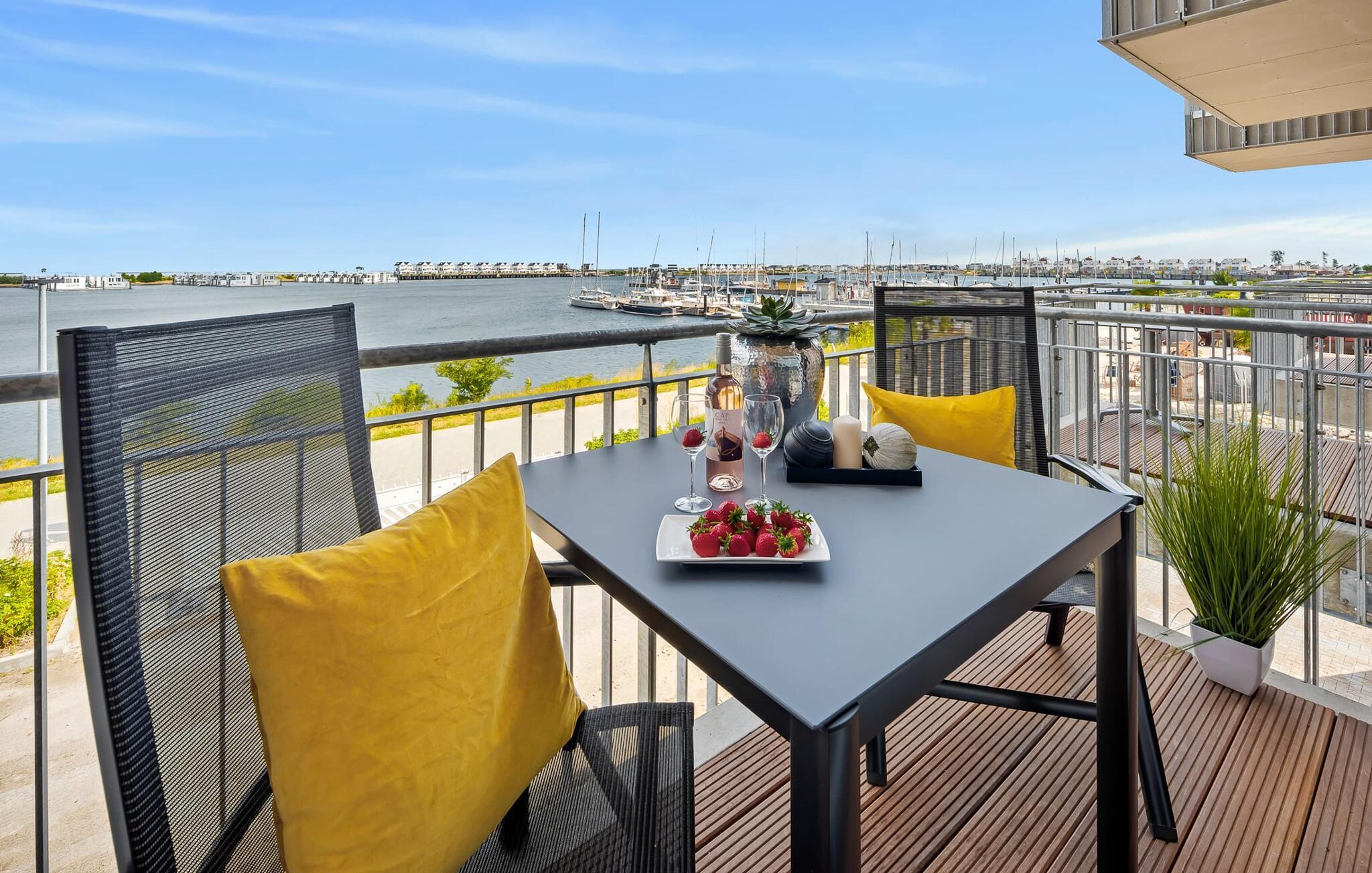 Vom Wohnbereich aus geht es direkt raus auf den Balkon. Hier könnt ihr es euch gemütlich machen und das Treiben auf der Promenade und im Hafen beobachten. Der ideale Platz für gemütliche Grillabende und den Sonnenuntergang.