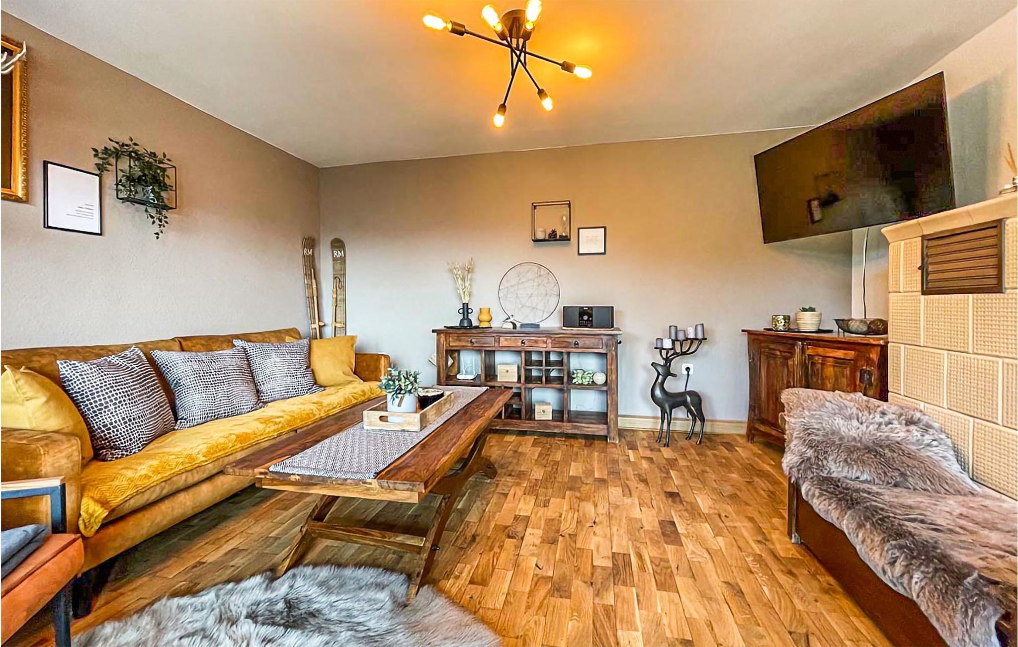 Ihr Ferienhaus verfügt neben der elektrischen Heizung über einen traditionellen Kachelofen. Damit erzeugen Sie eine wohlige Atmosphäre im ganzen Haus. In dem behaglich eingerichteten Wohnzimmer machen Sie es sich auf der Couch gemütlich und relaxen nach ausgedehnten Wanderungen vor dem Flatscreen-TV oder lassen Ihren Blick von der Terrasse in die Ferne schweifen.