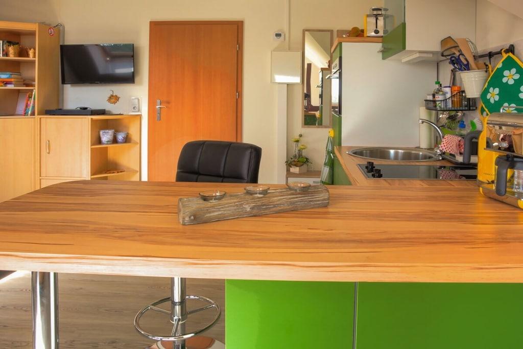 Das Apartment Kuschelkoje eignet sich auch für die Auszeit allein zu zweit oder für die junge Familie mit Baby. Auf 28 m² befindet sich alles was man zum Wohl fühlen braucht, eine gemütliche Leseecke, eine Küche mit Herd, Kühlschrank und Mikrowelle mit vielen Funktionen. Ein Licht durchflutetes Bad mit Dusche macht die Kuschelkoje komplett.