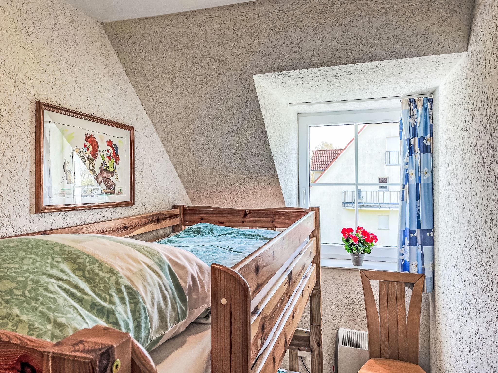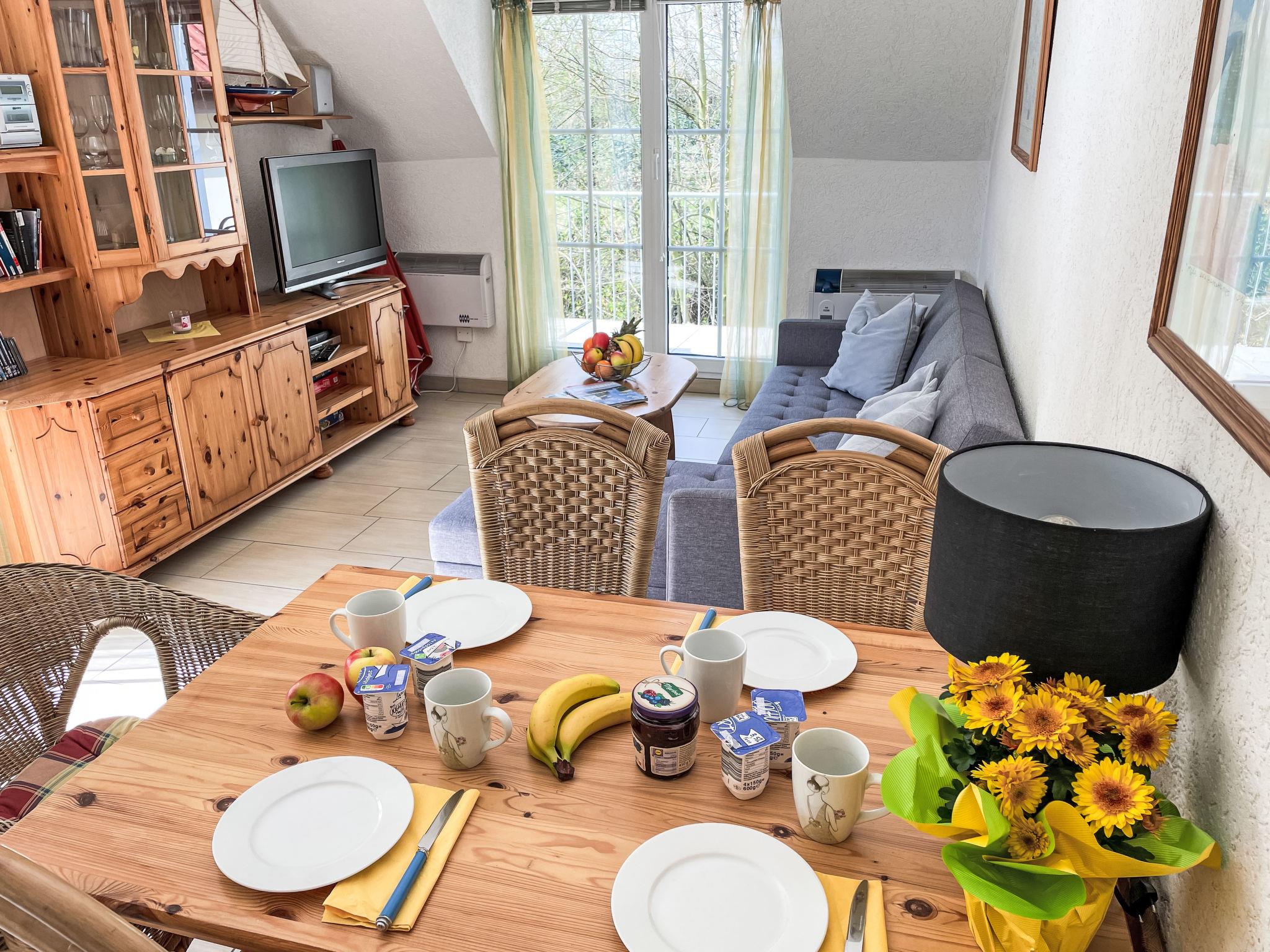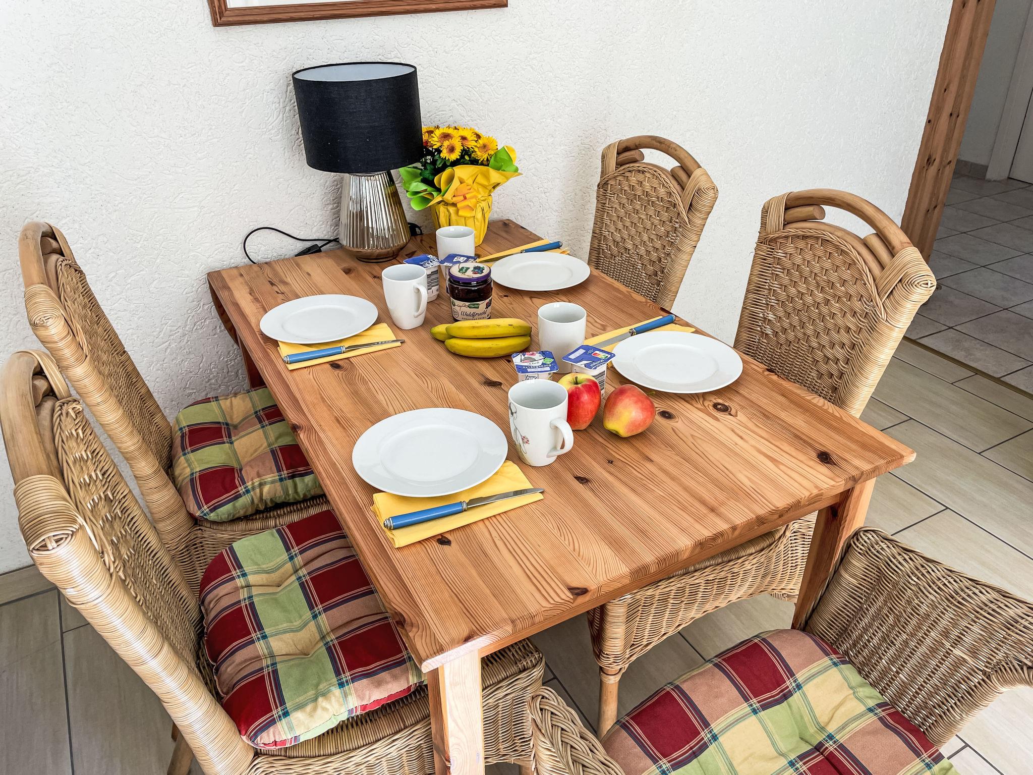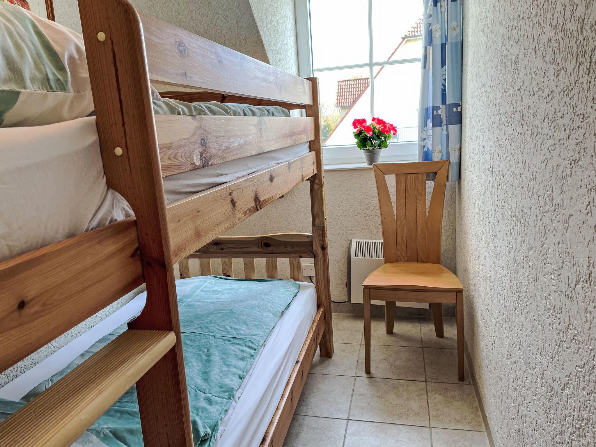 3-Zimmer-Wohnung 50 m2 im 1. Stock. Teilweise abgeschrägt: Wohn-/Esszimmer mit Sat-TV (Flachbildschirm), CD. Ausgang zum Balkon. 1 Zimmer mit 1 Doppelbett (180 cm, Länge 200 cm). 1 Kinderzimmer mit 1 Bett (90 cm, Länge 200 cm), 1 Schlafmöglichkeit (80 cm, Länge 200 cm). Kochnische (Backofen, 4 Glaskeramikplatten, elektrische Kaffeemaschine). Dusche/WC. E-Heizung. Kleiner Balkon 5 m2, Südlage, kleiner Balkon 5 m2, Westlage. Balkonmöbel. Zur Verfügung: Internet (Wireless LAN, gratis). Bitte beachten: Nichtraucher-Unterkunft. Rauchmelder. Die Schlafmöglichkeit im Kinderzimmer ist ein Ausziehbett (Tandembett).