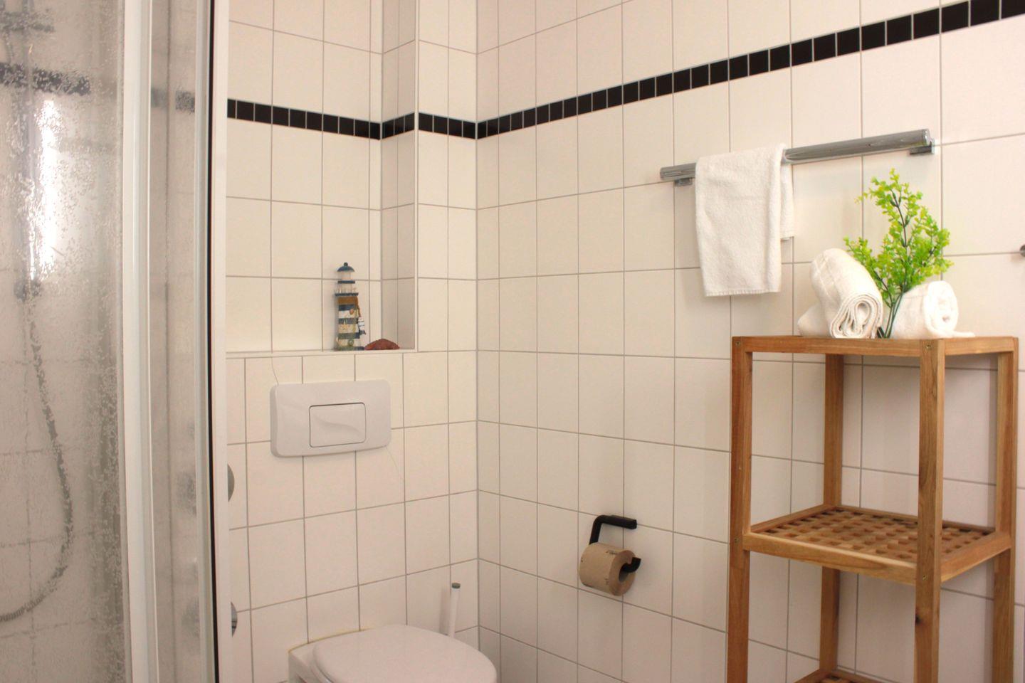 Das Badezimmer verfügt über eine Dusche, eine Waschtisch, Waschmaschine und WC.