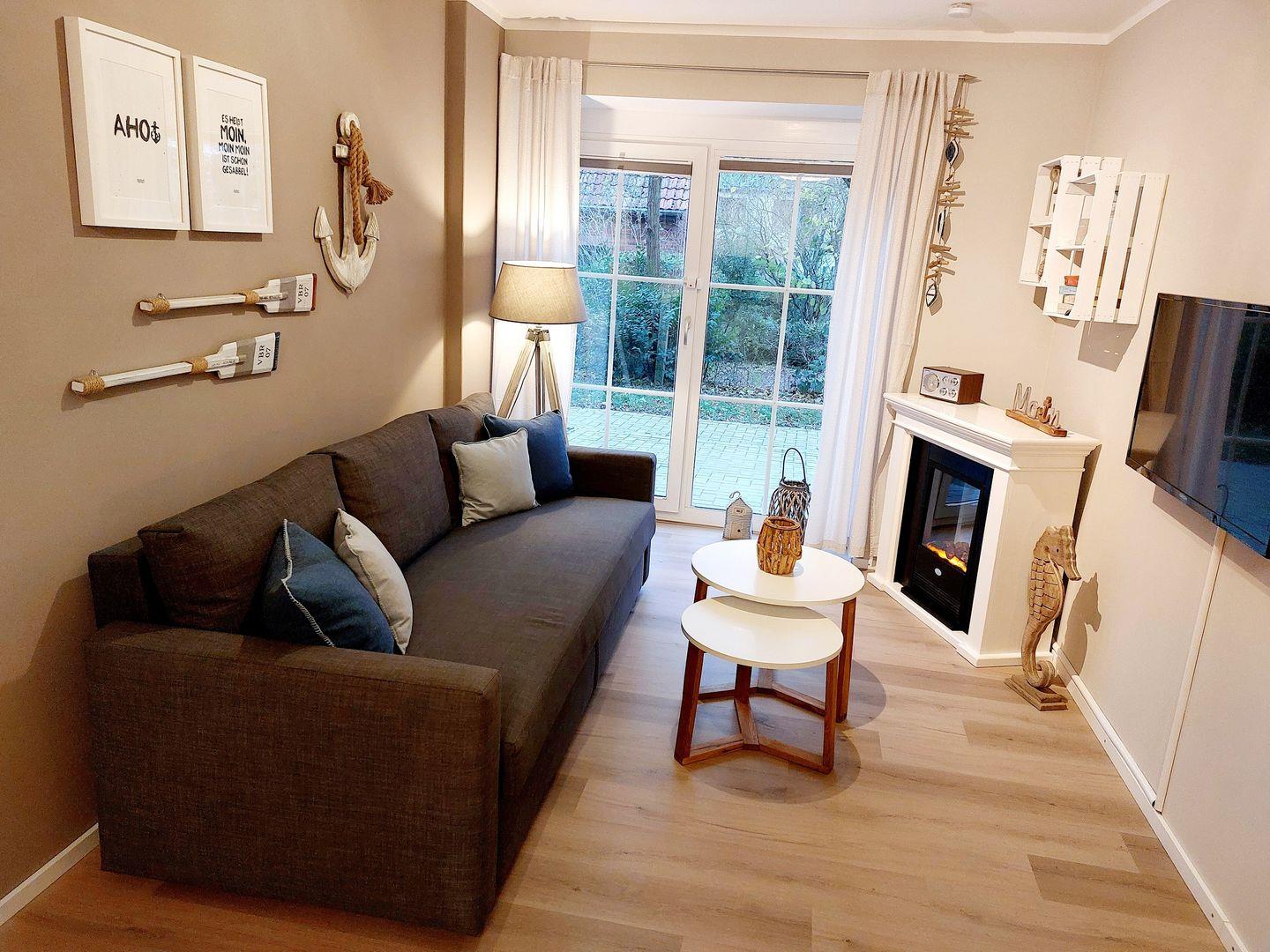 Das helle maritim eingerichtete Wohn- und Esszimmer verfügt über ein gemütliches Sofa, dass bequem zu einem Schlafplatz für zwei Personen umfunktioniert werden kann, ein TV-Gerät, einen Elektrokamin und einen Esstisch. Die moderne Küchenzeile ist in den Raum integriert und unter anderem mit Kühlschrank mit Gefrierfach, Herd, Wasserkocher, Kaffeemaschine und Toaster ausgestattet.