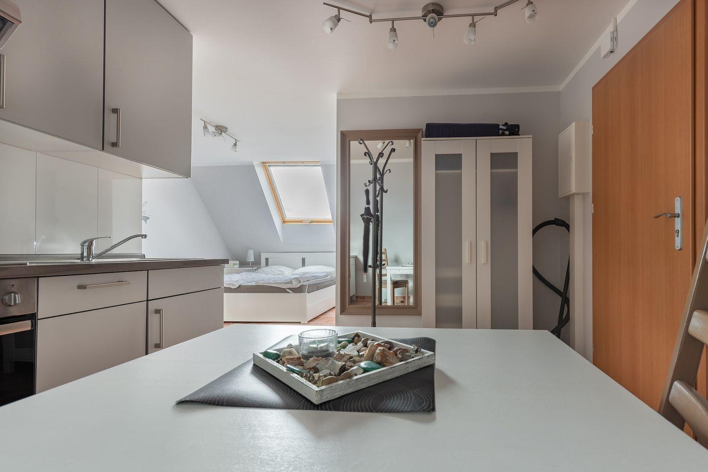 Die offen gestaltete Raumaufteilung bietet Ihnen eine kleine Küchenzeile, die unter anderem mit Herd mit Backofen, Geschirrspülmaschine, Mikrowelle, Kaffeemaschine und vielem mehr ausgestattet ist, einen komfortablen Esstisch und ein Doppelbett (durchgehende Matratze). Außerdem verfügen Sie über einen Kleiderschrank für Ihre Garderobe und ein TV-Gerät.