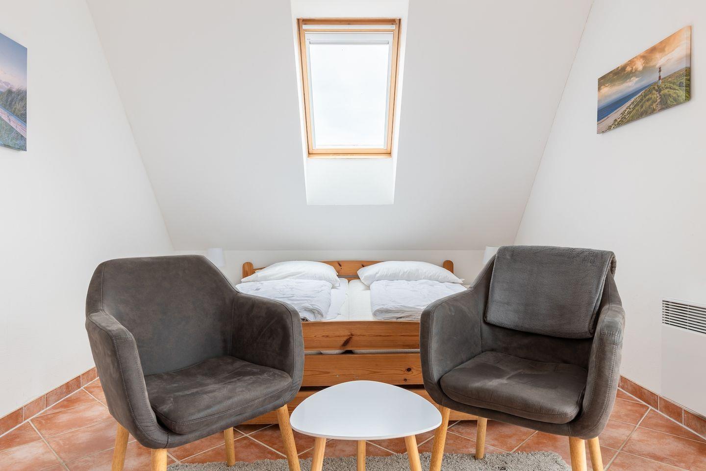 Sie verfügen über einen Essbereich mit kleiner Küchenzeile, die gut ausgestattet ist und einen Esstisch an dem Sie bequem Ihre Mahlzeiten einnehmen können. Weiterhin bietet die Wohnung ein komfortables Doppelbett, einen Sitzbereich und ein TV-Gerät.