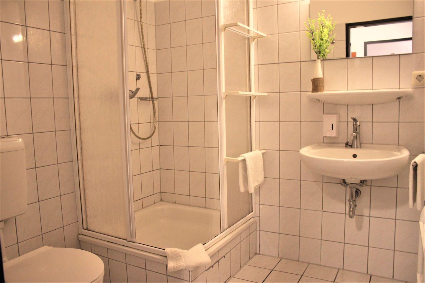 Ein innenliegendes Badezimmer mit Dusche, Waschtisch und WC runden die Ausstattung der Wohnung ab.