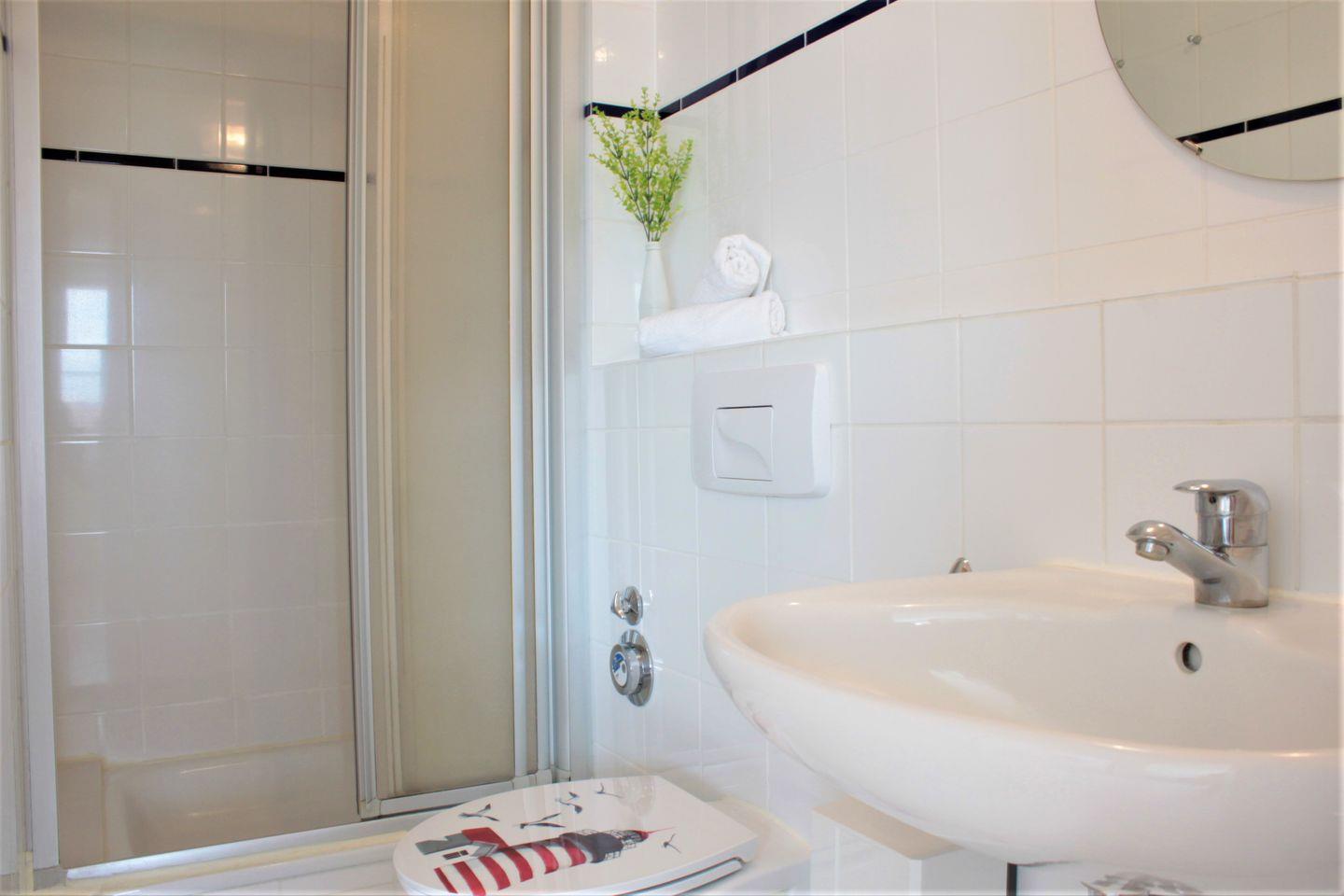 Das Badezimmer bietet Ihnen eine Dusche, Waschtisch und WC.
