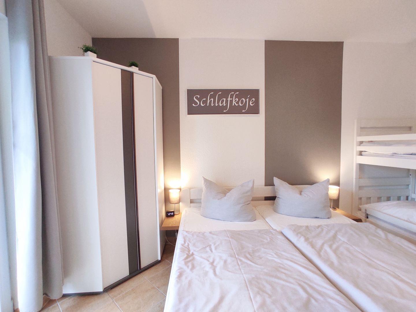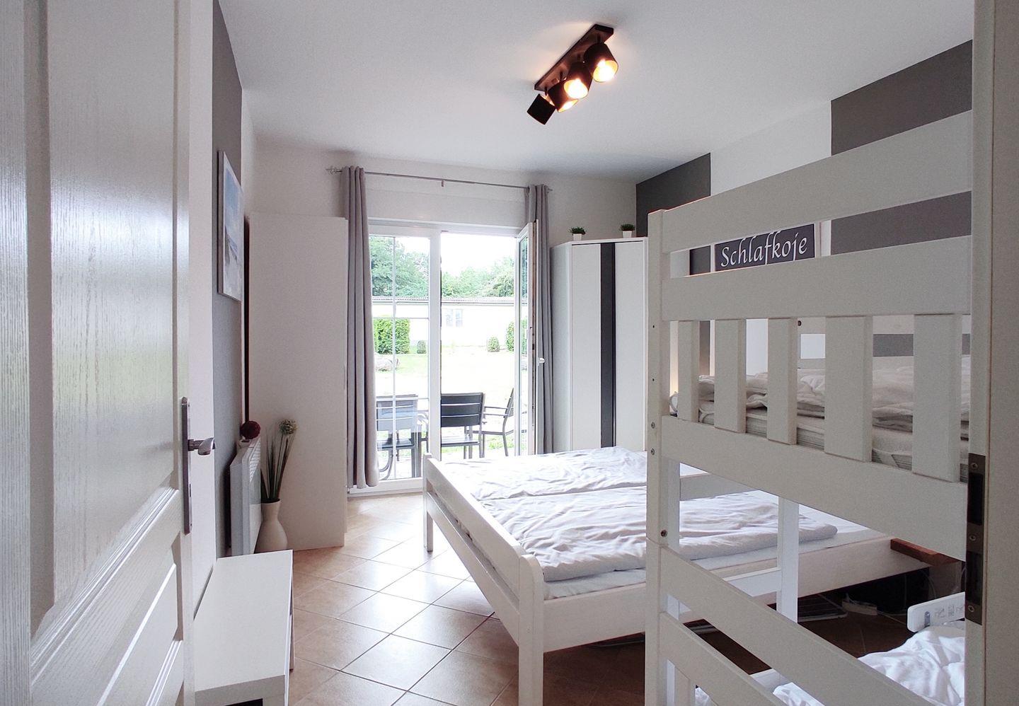 Die Ferienwohnung verfügt über ein gemütliches Schlafzimmer, das mit einem geräumigen Doppelbett ausgestattet ist, das für erholsame Nächte sorgt. Es gibt auch ein Etagenbett, das zusätzliche Schlafplätze bietet, ohne Kompromisse beim Komfort einzugehen.