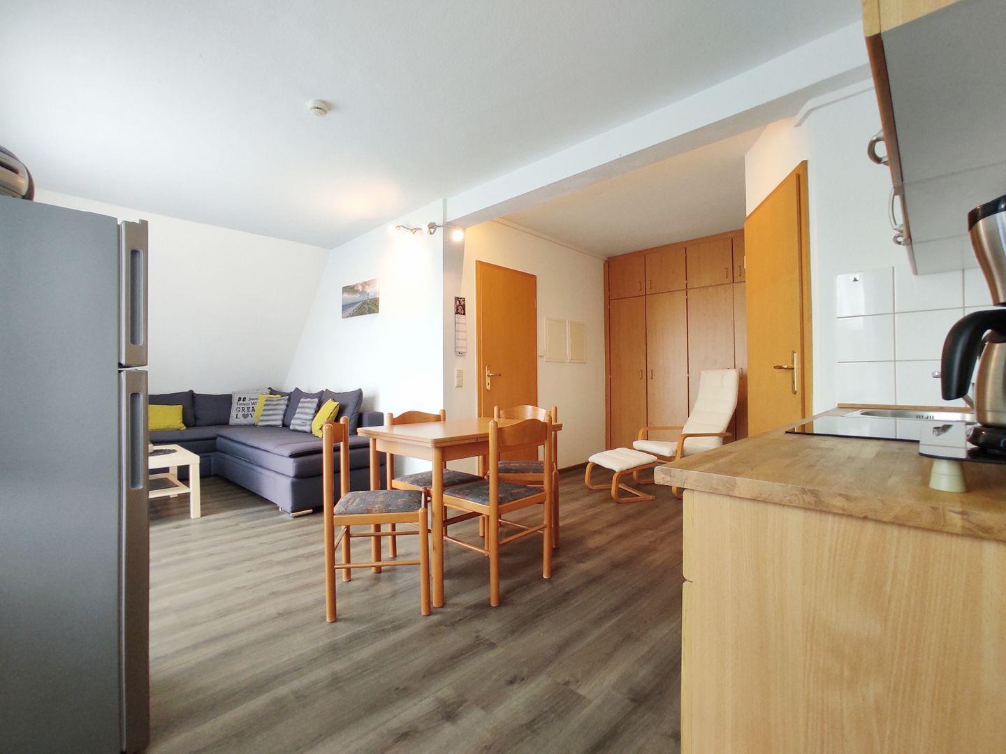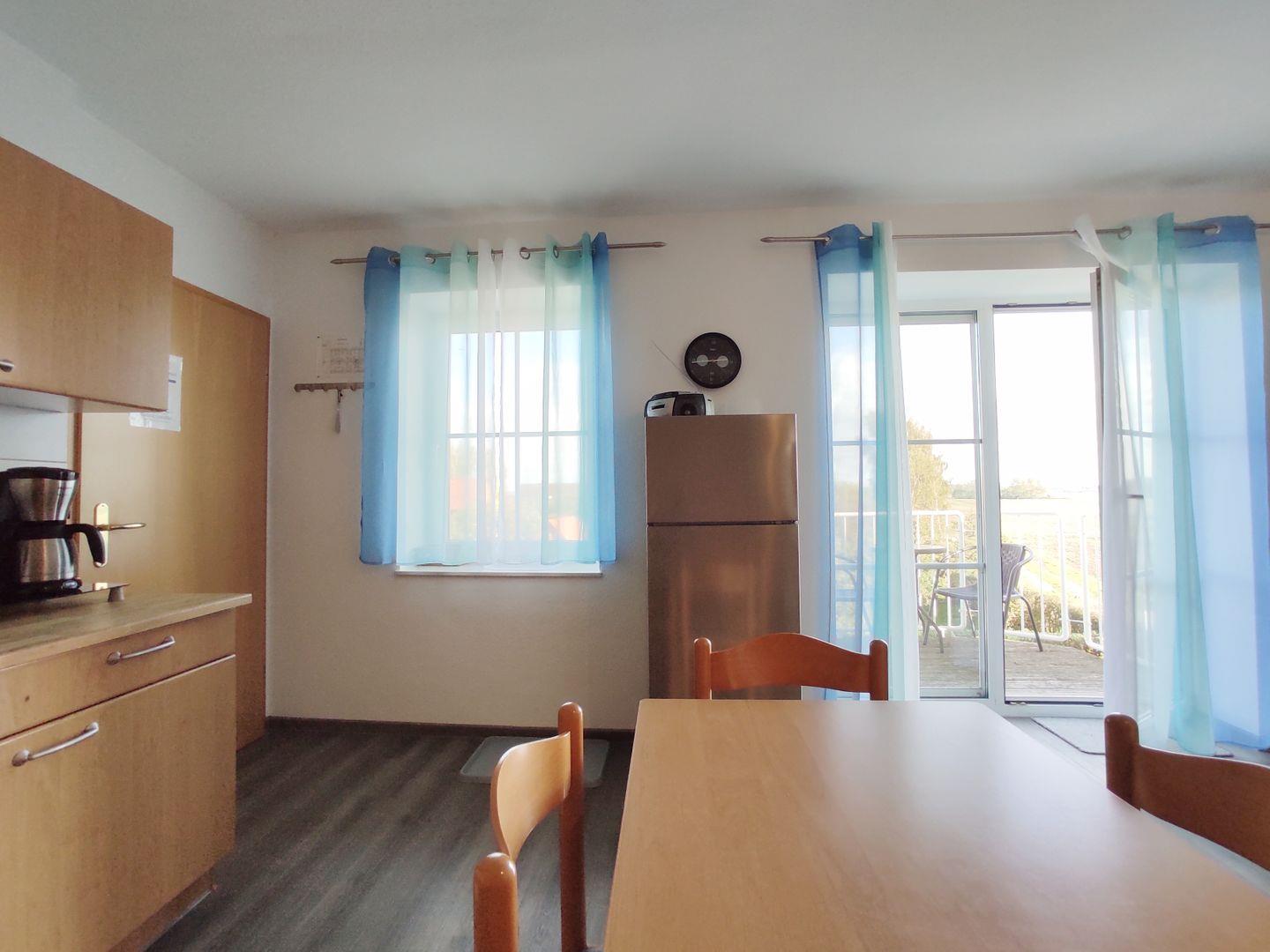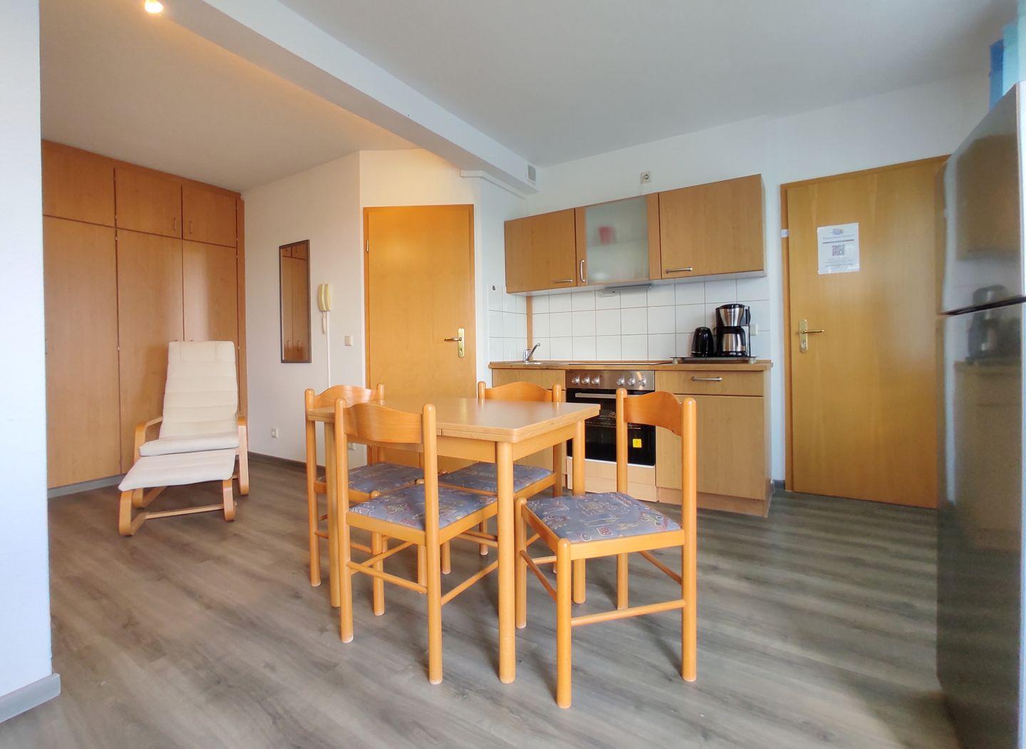 Das Wohnzimmer grenzt an die offene Küche, die gut ausgestattet ist. Sie verfügt über einen Herd mit Backofen, einen geräumigen Kühlschrank mit Gefrierfach, eine Kaffeemaschine, einen Toaster, einen Wasserkocher und einen Eierkocher. Ein Esstisch lädt dazu ein, gemeinsame Mahlzeiten zu genießen und sich über die Erlebnisse des Tages auszutauschen.