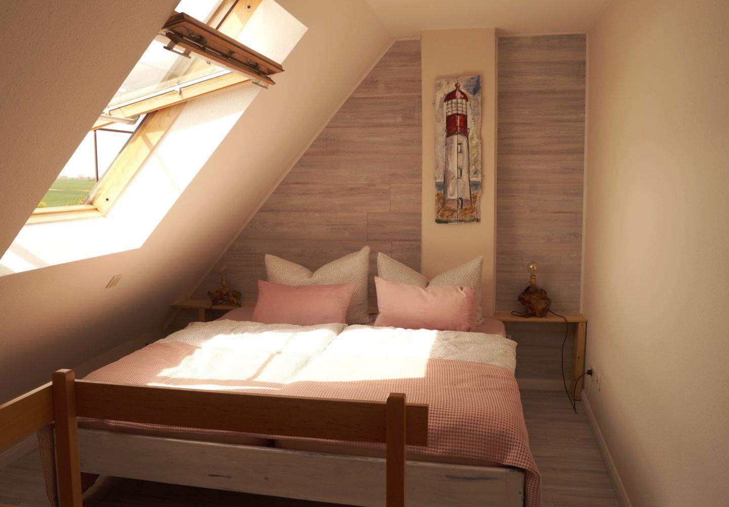 Das Schlafzimmer lädt mit einem gemütlichen Doppelbett und einem geräumigen Kleiderschrank zum Wohlfühlen ein. Hier können Sie nach einem erlebnisreichen Tag zur Ruhe kommen und den Klang der Wellen im Hintergrund genießen. Zur Unterhaltung stehen Ihnen ein Fernseher, ein DVD-Player und ein Radio zur Verfügung.