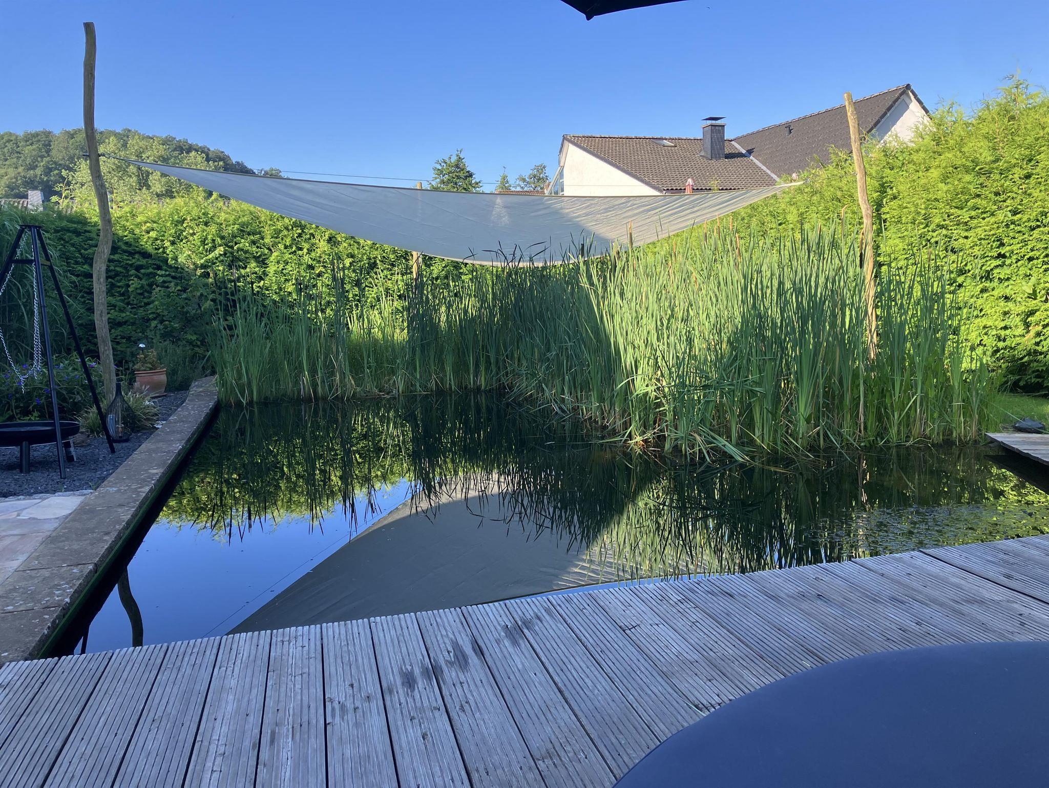 Der Naturschwimmteich umfasst eine schwimmbare Fläche von 3*7 Metern und ist 1,4m tief. Solardusche und Sonnendeck grenzen daran an. Über die große Terrasse mit Grill-, Ess- und Loungebereich erreicht ihr die Sauna und Ruhezone, beides im Haus. Neben diesen befindet sich im Erdgeschoss ein Badezimmer, eine umfangreich ausgestatte Küche mit angrenzendem Essbereich, ein Ofenraum und eine Abstellkammer. Im Obergeschoss liegen die 3 Schlafzimmer, ein weiteres Badezimmer, das Wohnzimmer mit gemauertem Kamin, großer Fensterfront und einem Balkon.