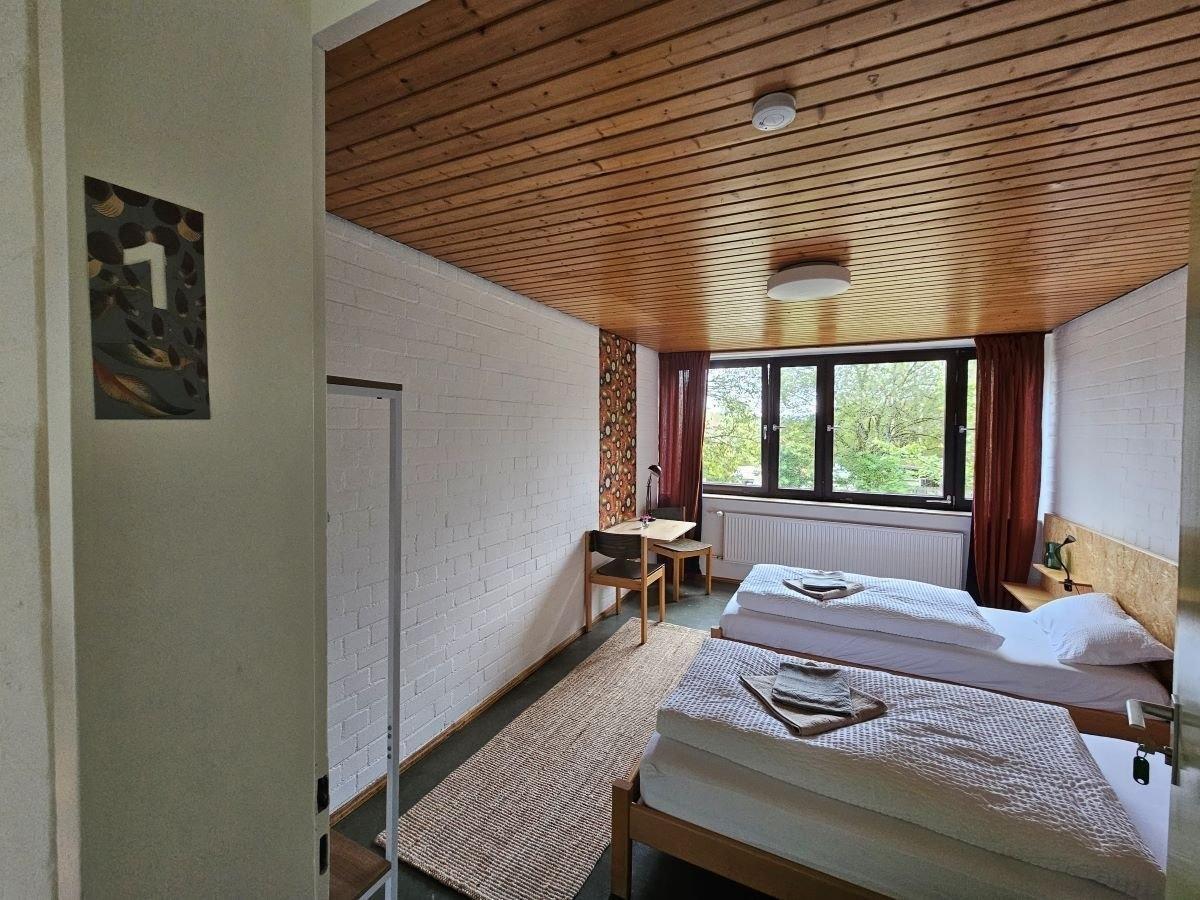 Dieses Zimmer verfügt über 2 getrennte Betten, welche man auch zusammenstellen kann. Ein eigener LAN-Anschluss und WLAN sind vorhanden. Ein Gemeinschaftsbad mit 2 Duschen und 2 Toiletten liegen auf der selben Etage, 2 weitere Bäder einen Stock tiefer.