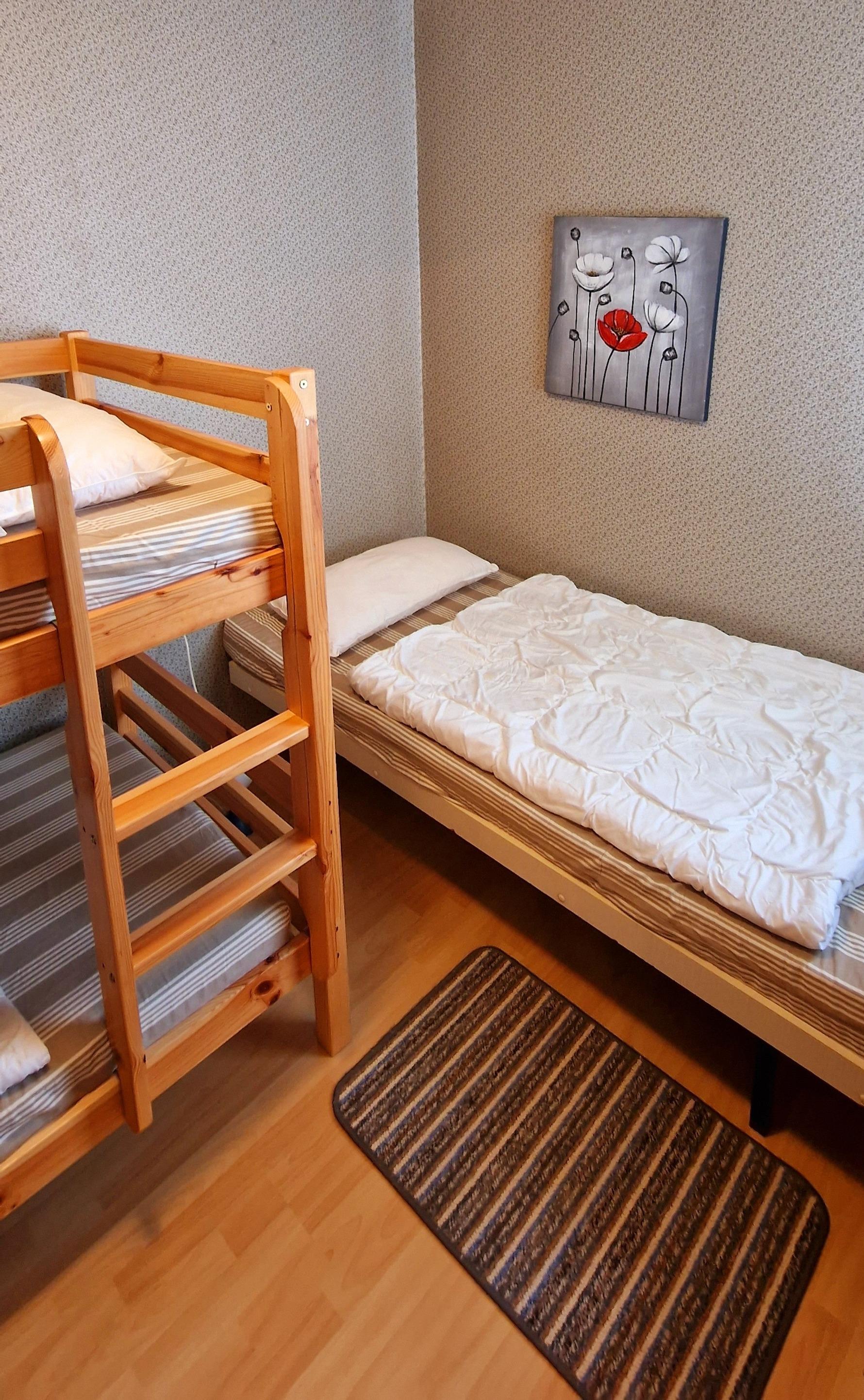 Die Wohnung 110 ist ausgestattet mit einem großzügigen Wohn- und Essbereich, einem Badezimmer, einem separaten WC und zwei Schlafräumen. Da Elternschlafzimmer besitzt zwei Einzelbetten, das Kinderschlafzimmer ein Einzelbett und ein Hochbett.