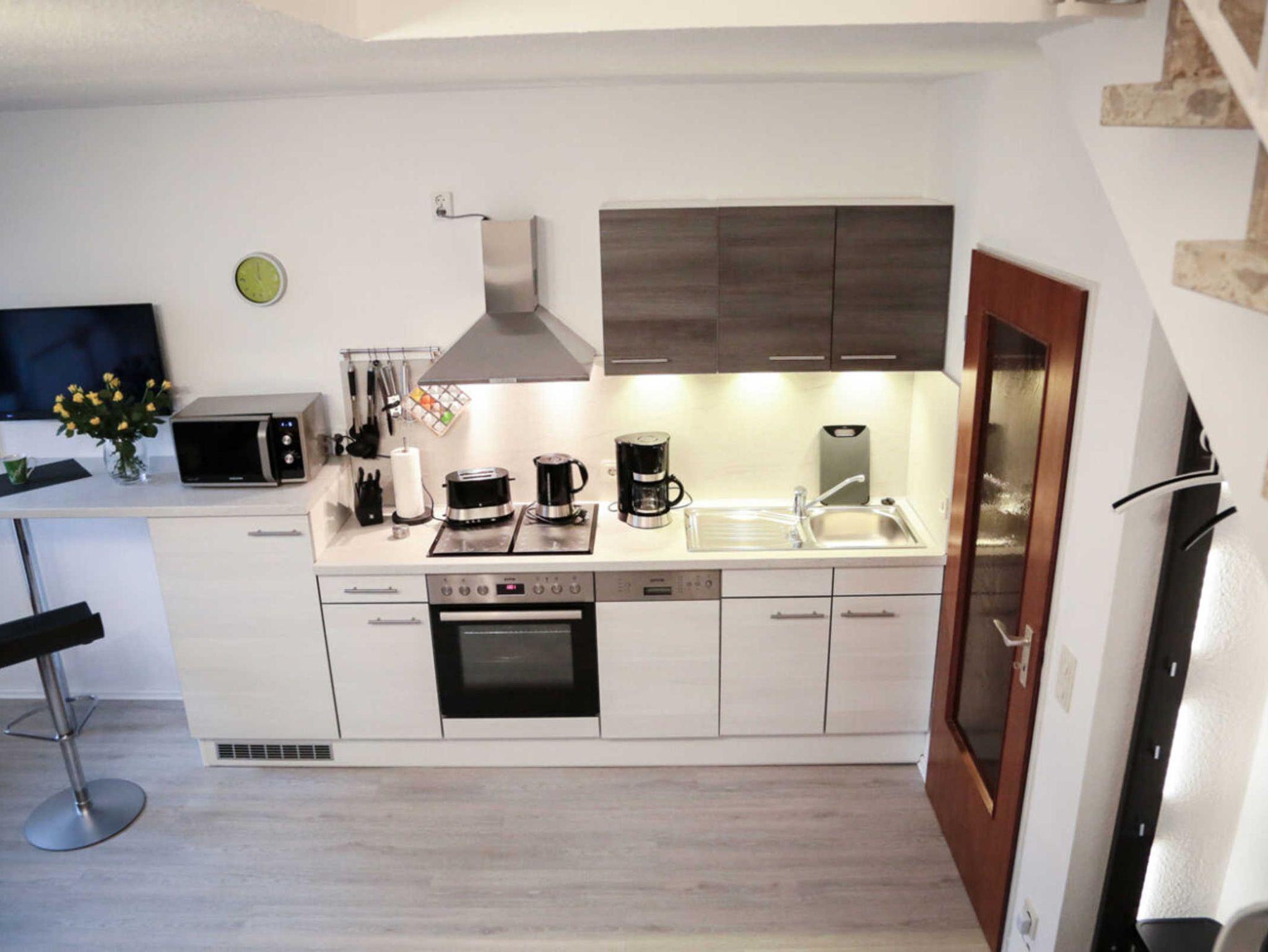 Vier Sterne Komfortferienwohnung für bis Personen, 47 m2 über 2 Etagen, Bettwäsche, Handtücher und Endreinigung sowie Parkplatz, sind Preis enthalten. Einbauküche mit Induktionsherd, Kühlschrank mit Gefrierfach, Geschirrspüler, Mikrowelle, Kaffeemaschine, Toaster,