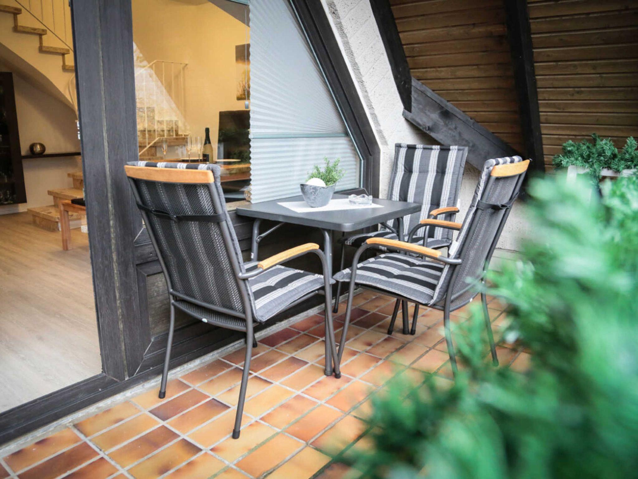 Überdachter Balkon mit hochwertigen Gartenmöbeln. Keine Haustiere erlaubt. Mindestmietdauer 3 Tage