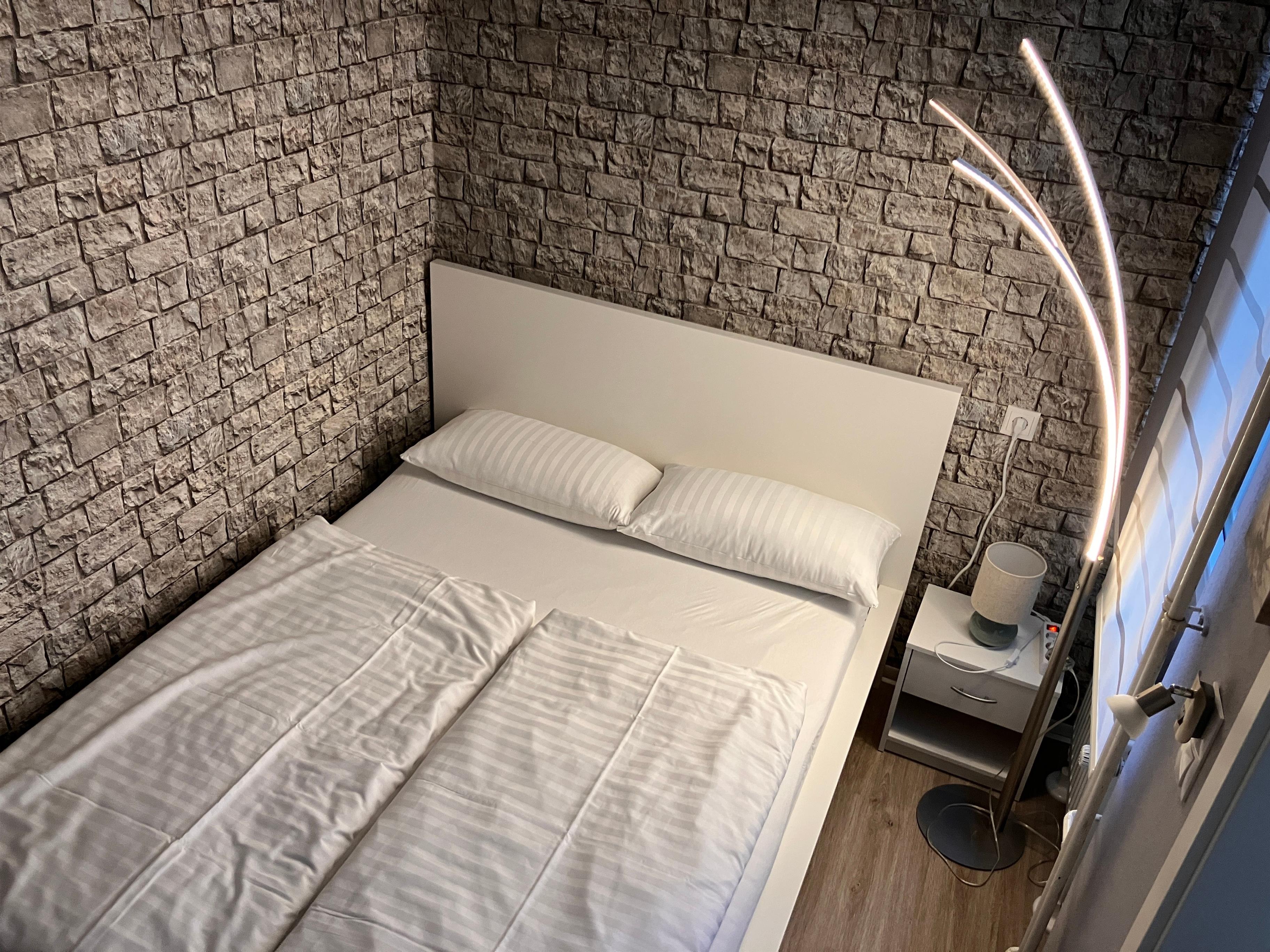 Im Schlafzimmer befindet sich ein Bett 140x200 und in dem zweiten Zimmer ein Bett 90 x 200.