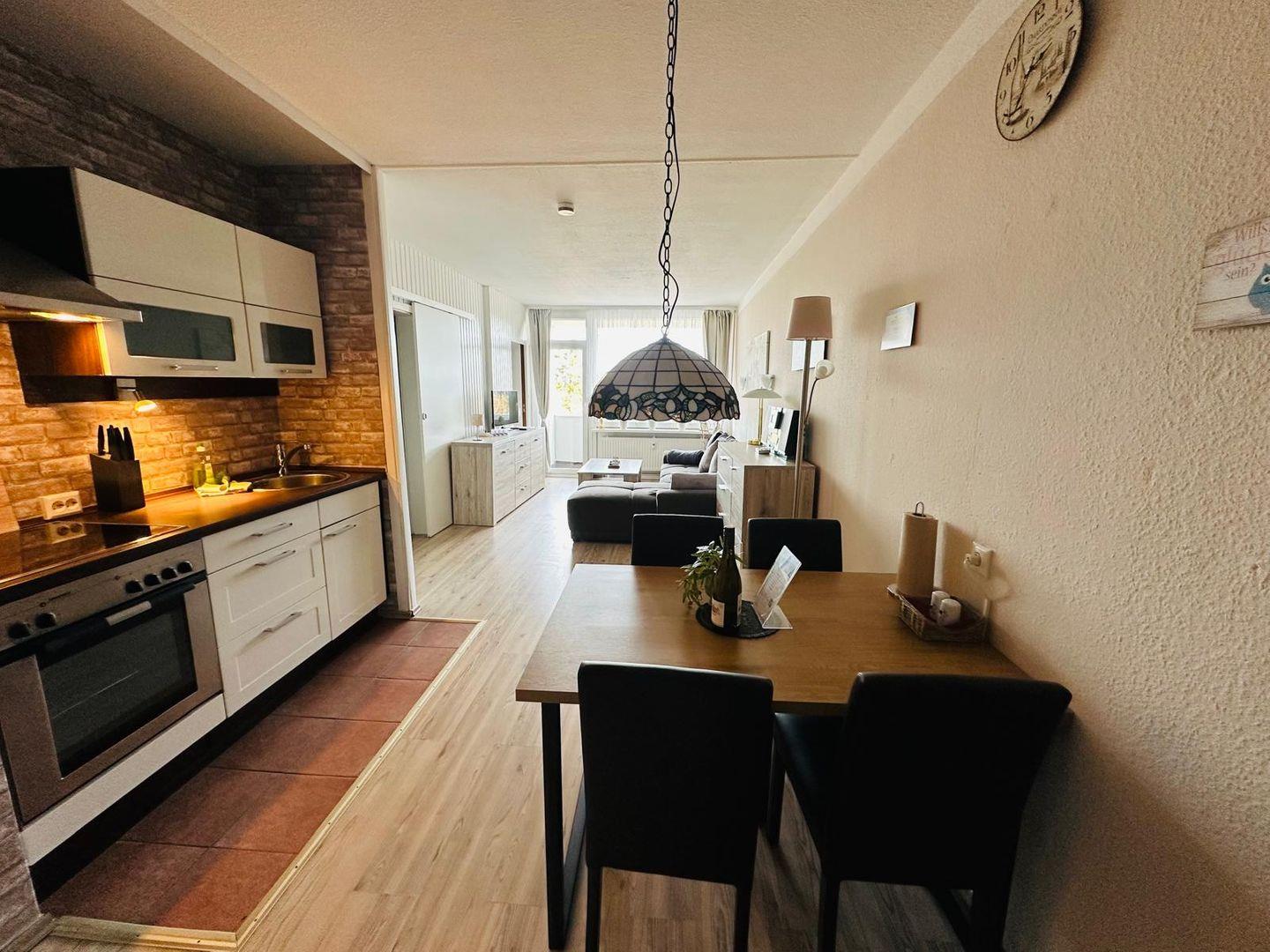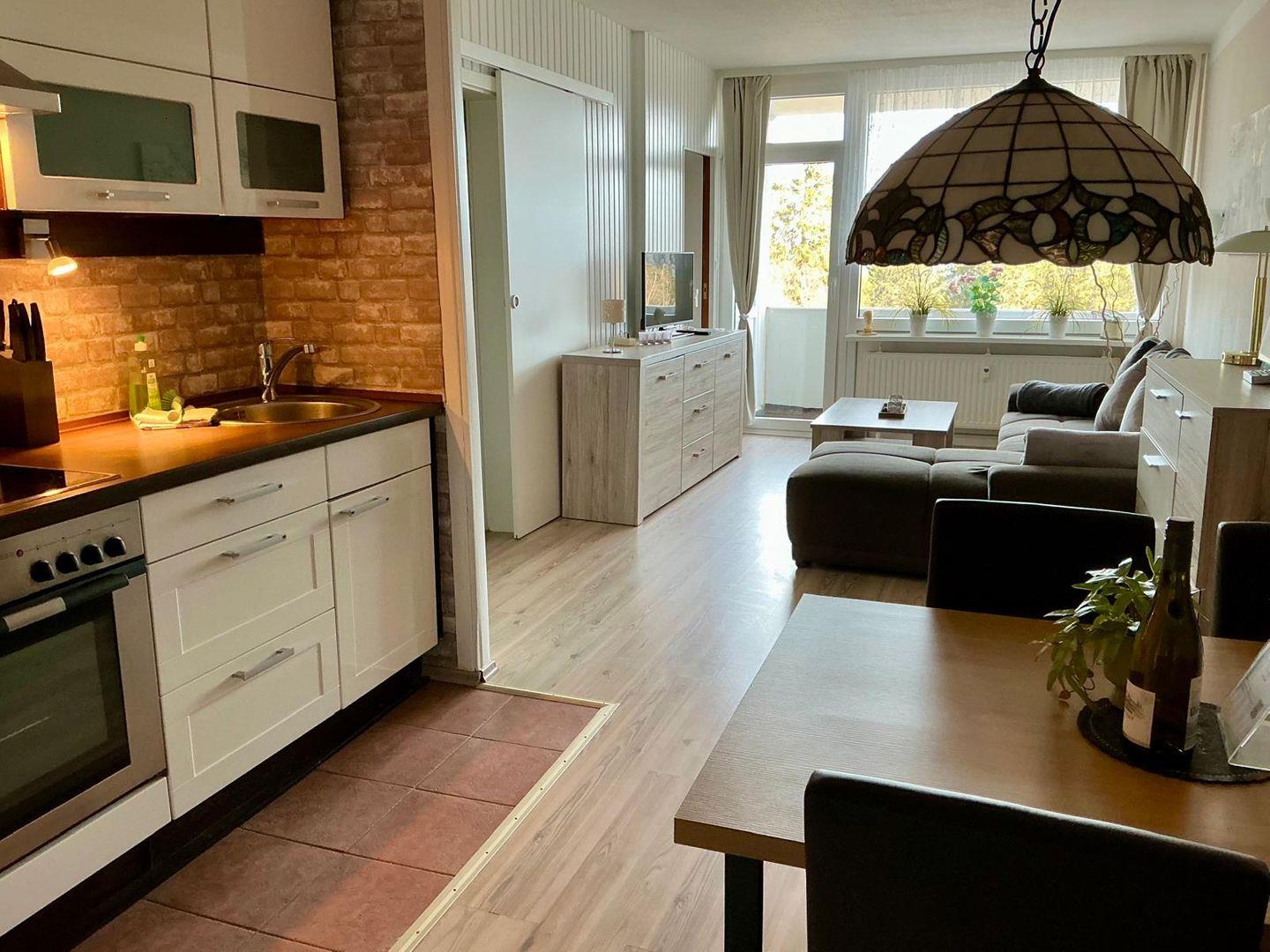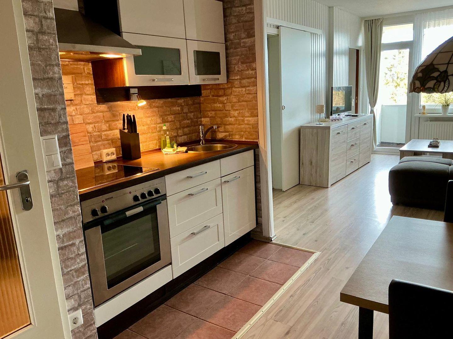Die Wohnung verfügt über zwei komfortable Schlafzimmer, die mit hochwertiger Bettwäsche ausgestattet sind und zum Entspannen einladen. In der offenen Küche, die zum Wohnzimmer übergeht, finden Sie alles, was Sie benötigen – von modernen Küchenutensilien über eine Kaffeemaschine und einen Toaster bis hin zu einem Backofen und einem Kühlschrank mit Gefrierfach. Ob ein richtiges Frühstück oder ein gemütliches Abendessen, Sie können Ihre kulinarischen Fähigkeiten hier voll entfalten!