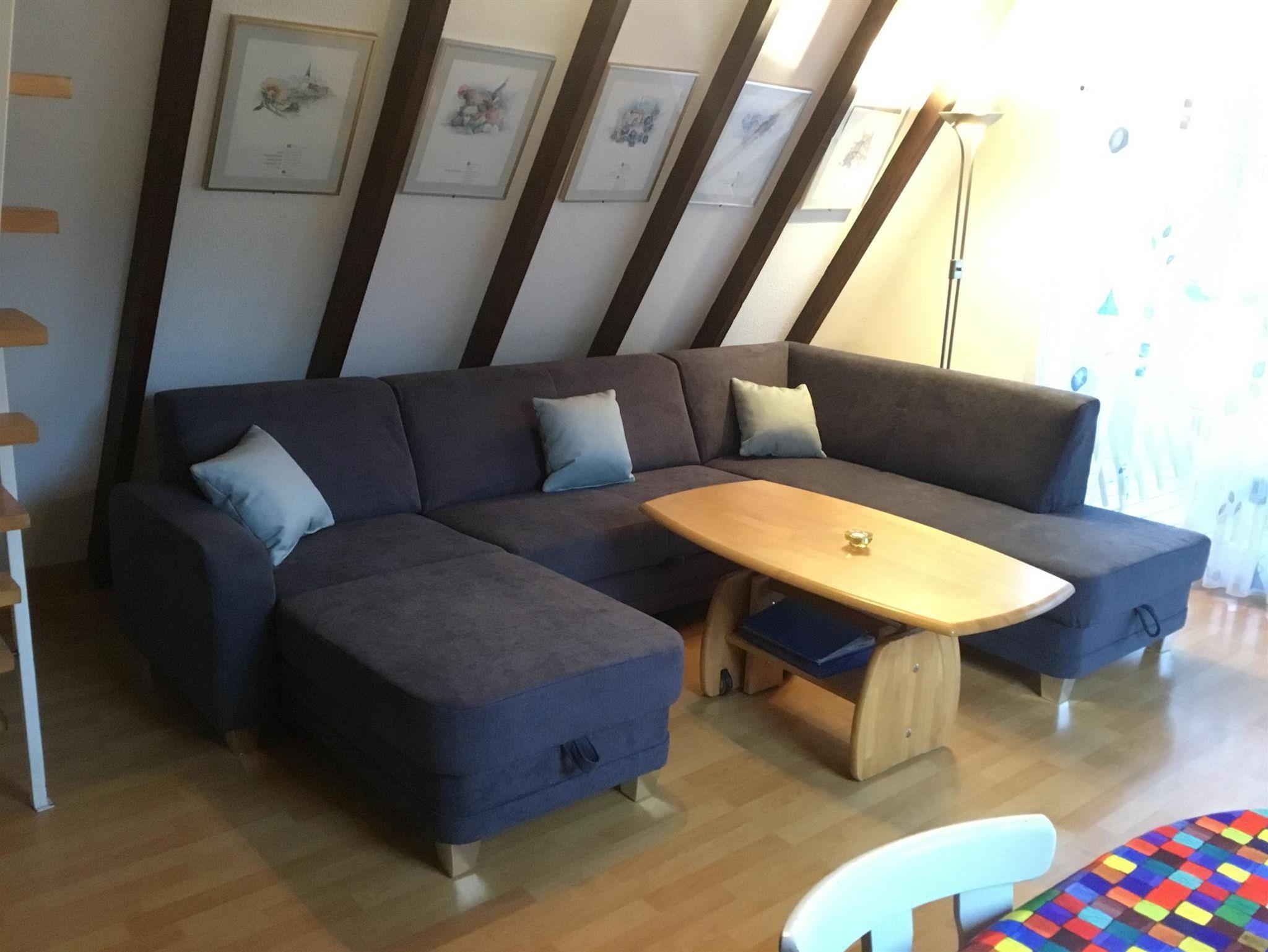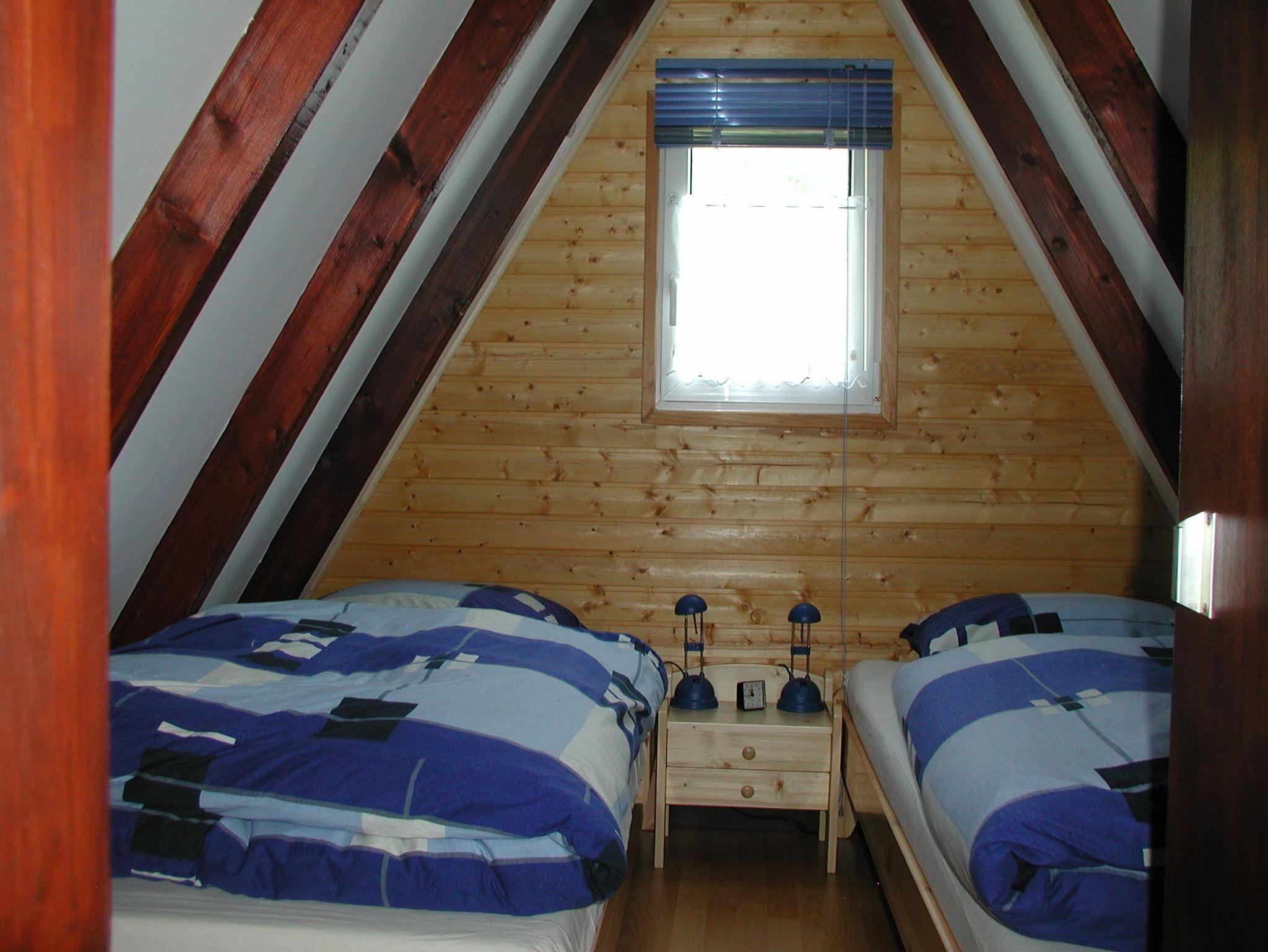 Im Obergeschoss befinden sich zwei Schlafzimmer mit 2 bzw. 3 Betten. Im Wohnzimmer kann die Couch ausgezogen werden.