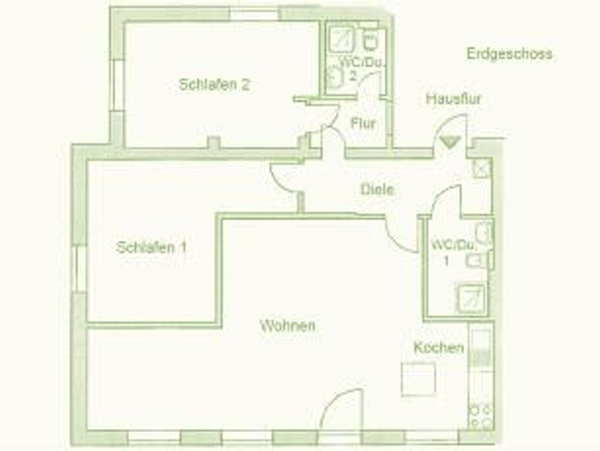 Raumaufteilung: 2 Schlafräume, 1 Wohnküche, 2 Badezimmer mit Dusche.