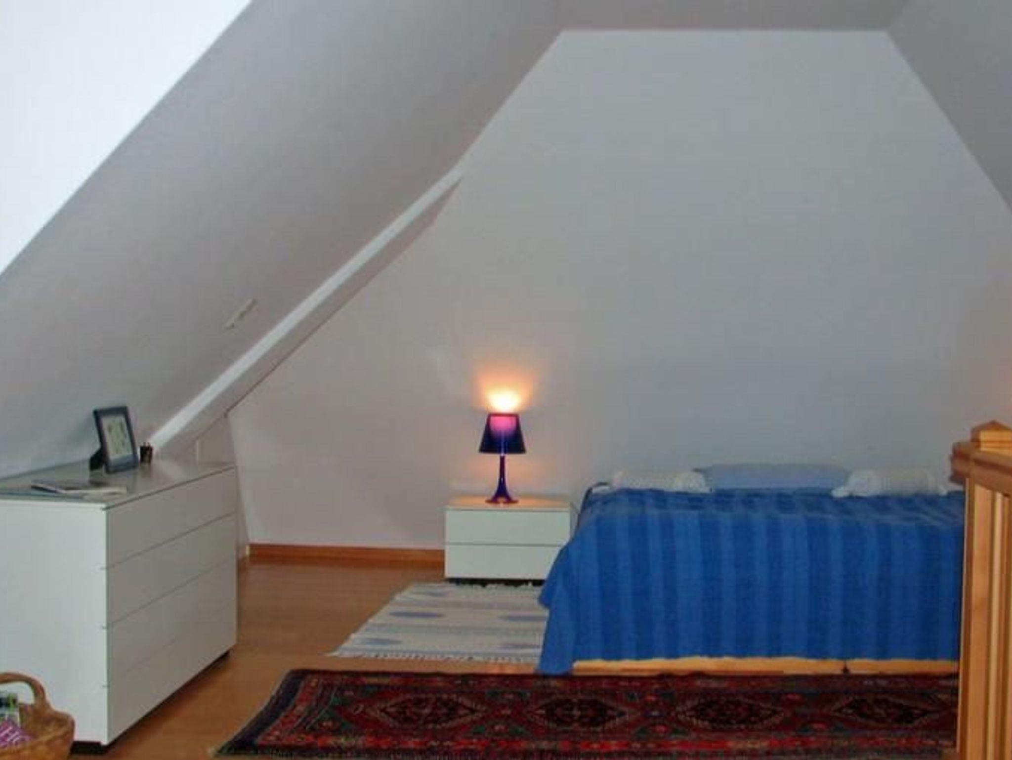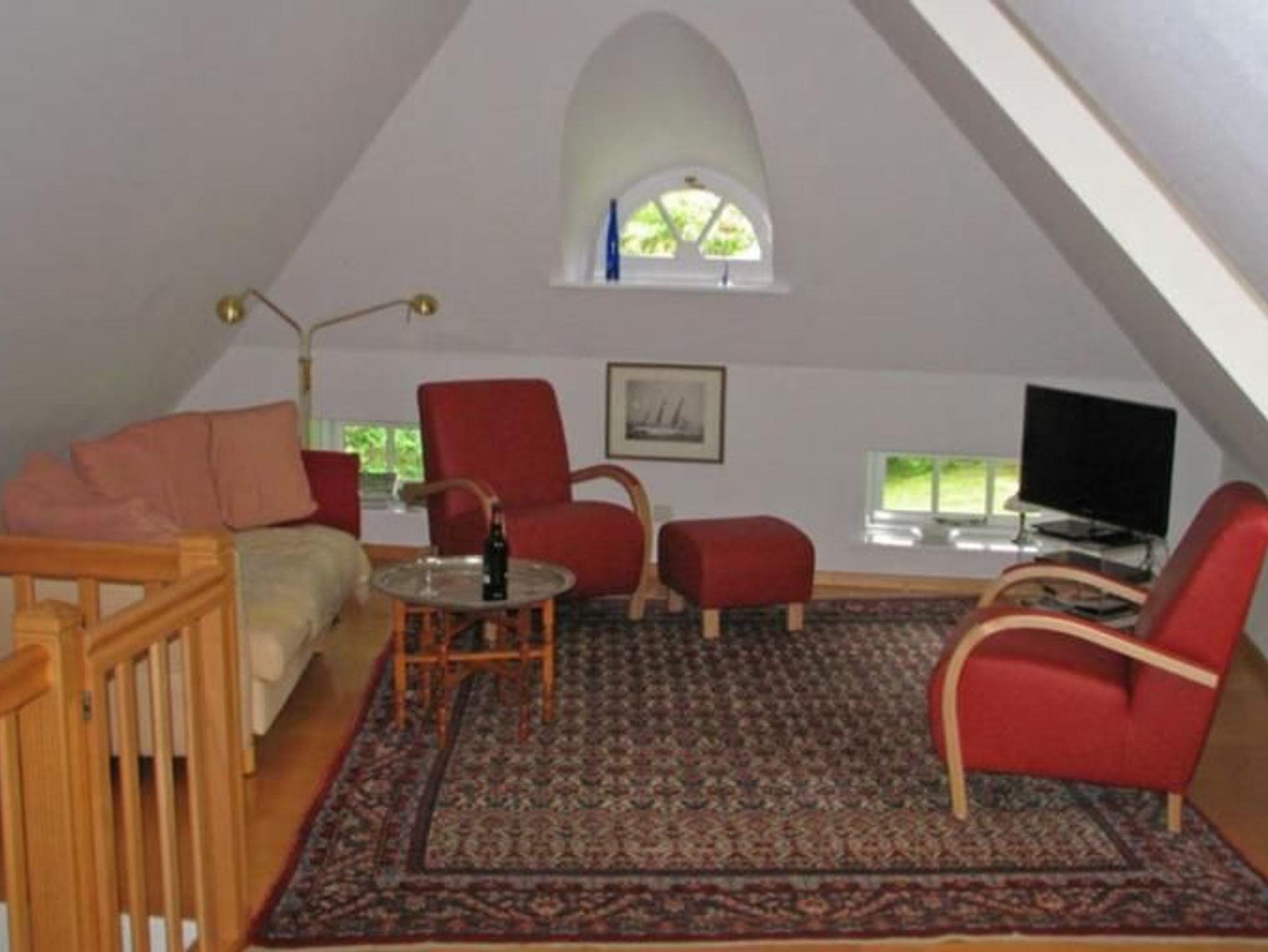 Der große Wohn- und Schlafbereich im Dachgeschoss hat zwei Einzelbetten, Sitzgarnitur und einen weiteren HD-Sat-TV mit Blue-Ray und DVD-Player.