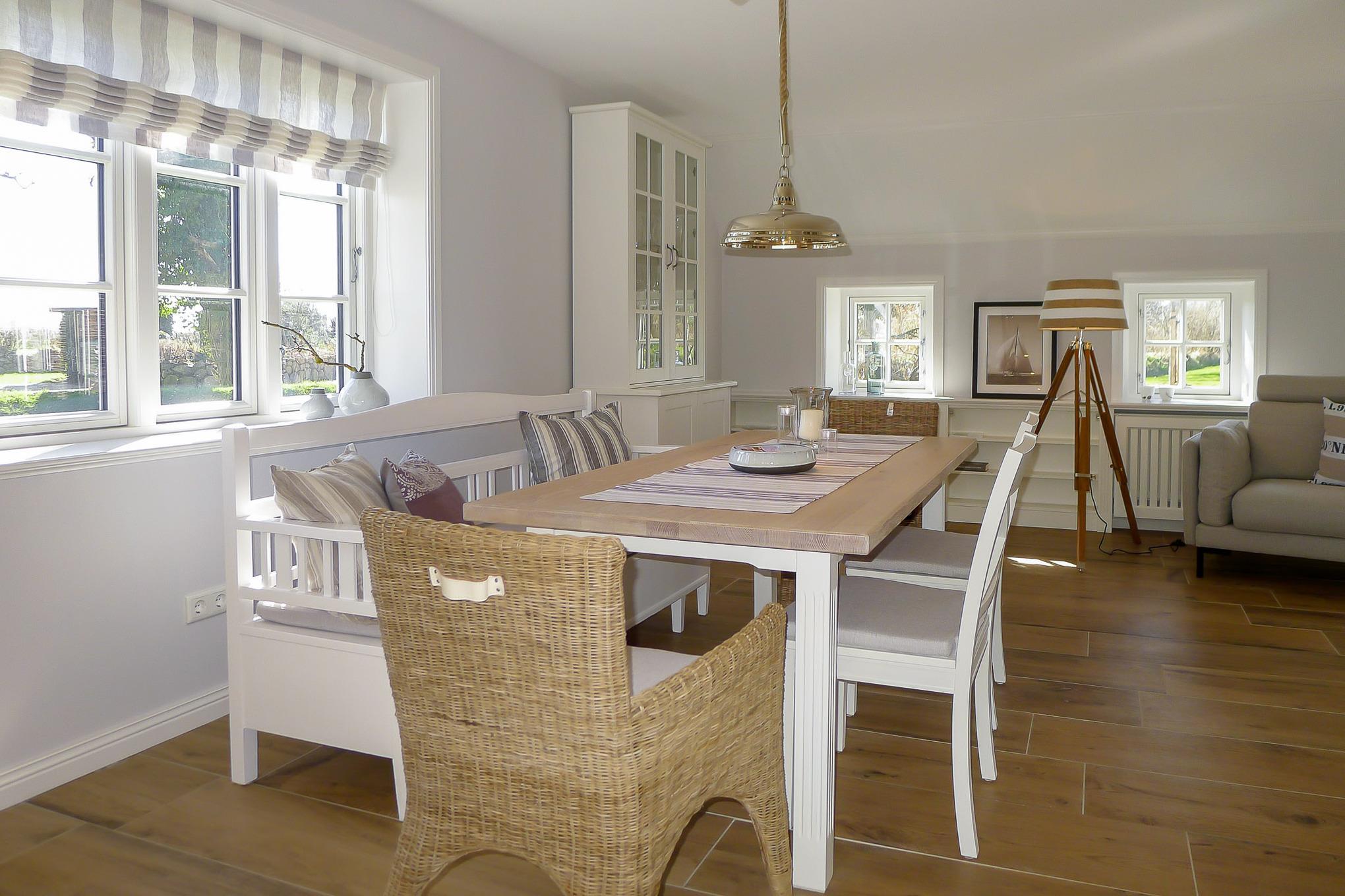 Das Reetdachdoppelhaus liegt in Nieblum-Goting, nur wenige Minuten zu Fuß vom Strand entfernt. Hier wird Ruhe und Erholung ganz gross geschrieben. Im Sommer relaxen Sie natürlich auf der Terrasse mit Garten und Strandkorb, und in den kühlen Monaten ist ein wärmendes Feuer im Kamin und ein Saunagang genau das Richtige. Egal, zu welcher Jahreszeit Sie Föhr genießen, ausgiebige Sparziergänge am Strand gehören einfach dazu. Das Goting-Kliff ist nicht weit entfernt, und hier lassen Sie sich den Wind um die Nase wehen. Goting ist der ruhige Ortsteil von Nieblum, das Sie in wenigen Minuten zu Fuß oder mit dem Rad erreichen. Das Friesendorf gilt seit langem als eines der schönsten Dörfer in ganz Norddeutschland. Ein Ausflug nach Nieblum mit seinen alten Kapitänshäuser, Einkaufsmöglichkeiten, Restaurants und urigen Kneipen ist zu jeder Jahreszeit eine schöne Idee.