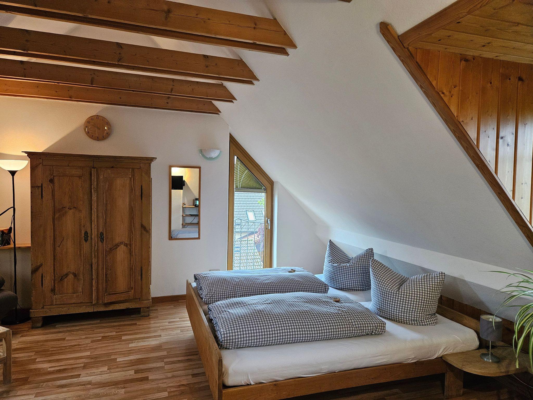 Unser Appartement ?Spatzennest? befindet sich im zweiten Stock unseres Gästehauses. Sie wohnen in einen großen Wohn-Schlafraum (30qm) mit integrierter Küchenzeile und seperatem Bad. Das Appartement ist für 2 Personen mit max. 1 Kind geeignet. In der Kombination mit dem Schwalbennest können Sie auch als größere Familie entspannt Ihren Urlaub bei uns genießen. Die Terrasse der Gaststube unter unserer schattenspendenden Linde, sowie der großzügige Garten ermöglichen Ihnen viele Stunden im Freien zu Genießen und zu Verweilen.