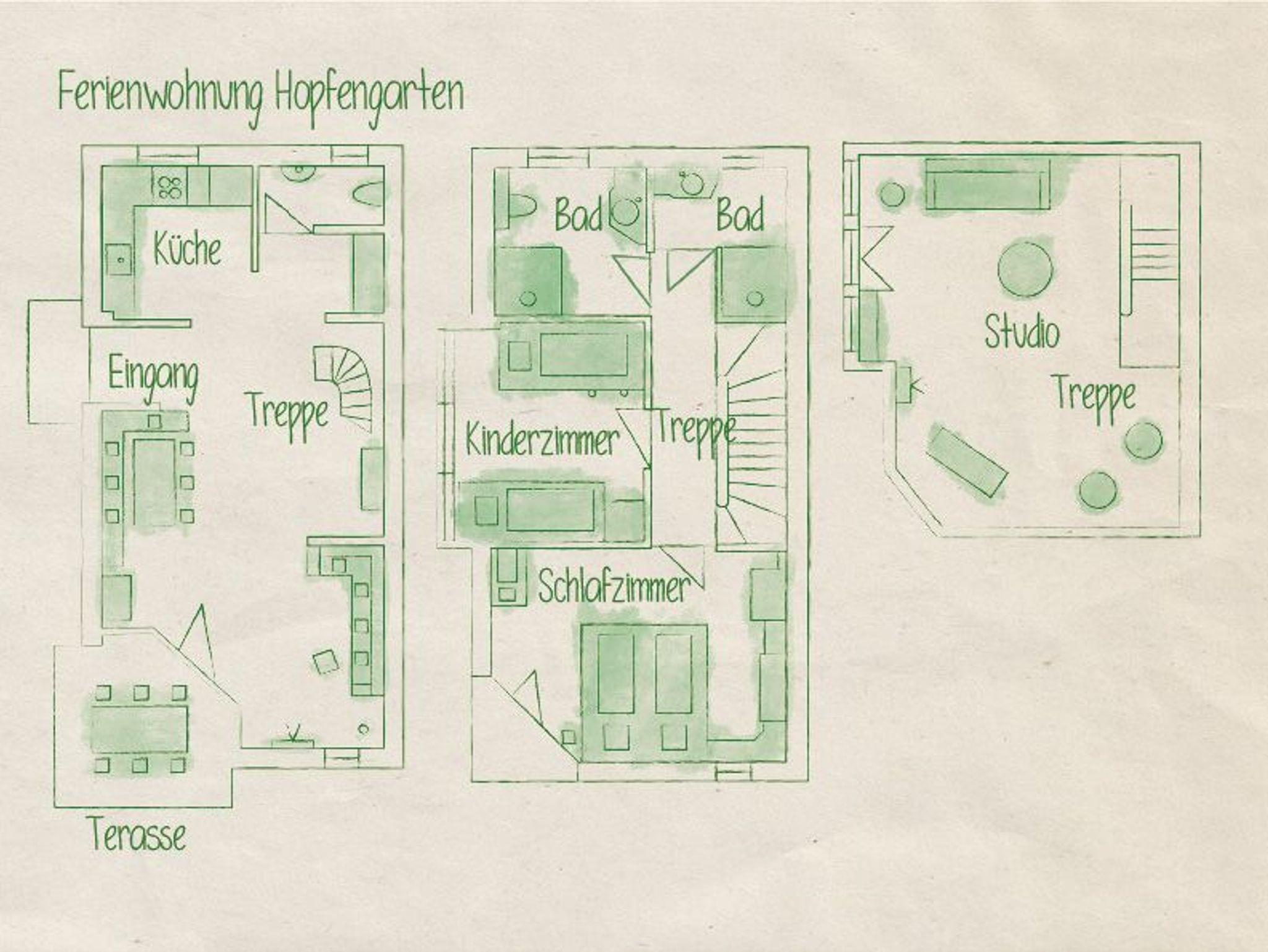 Im EG befinden sich die Küche und der Wohn-/Essbereich mit direktem Zugang zu Ihrer eigenen Terasse. Hier genießen Sie Ihr Frühstück in der Morgensonne oder ein Glas Wein zum Sonnenuntergang. Im OG finden Sie das Elternschlafzimmer mit einem kleinen Balkon, ein Kinderzimmer direkt daneben und 2 Bäder. Im DG erwartet Sie ein Studio mit dem Blick in den Hof und über Lilling. Dieses Studio ist Ihr Rückzugsort für gemütliches Relaxen, kann aber auch als drittes Schlafzimmer oder zweites Wohn-/Spielzimmer genutzt werden. Im Studio können auch noch bis zu 2 Personen übernachten.