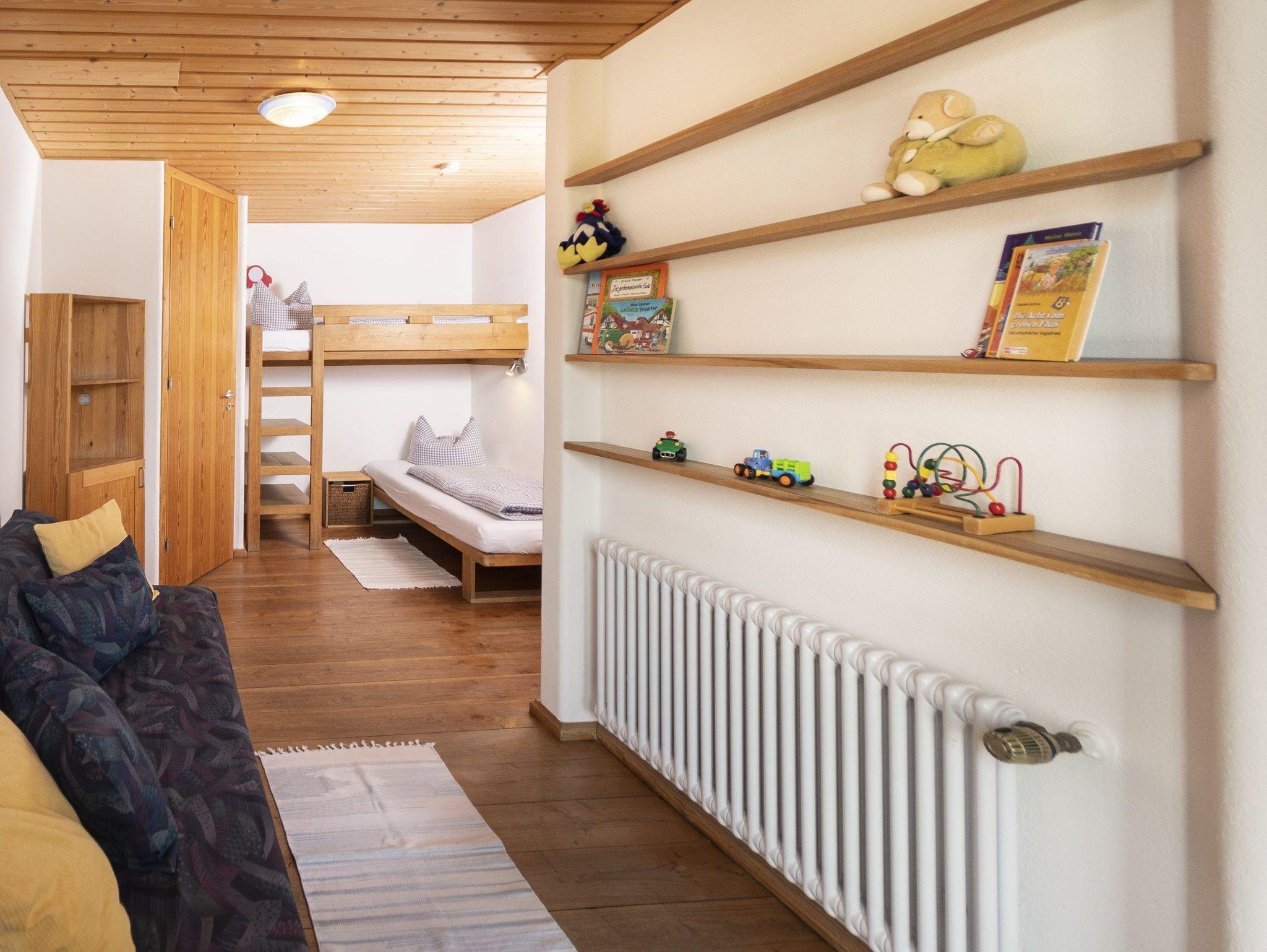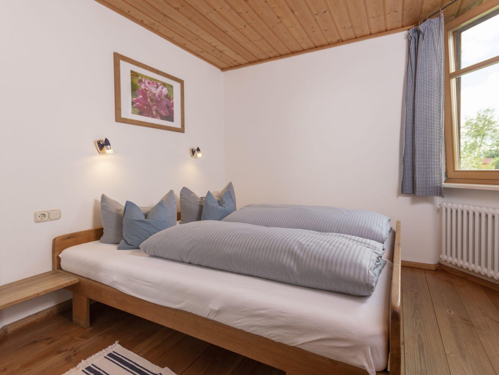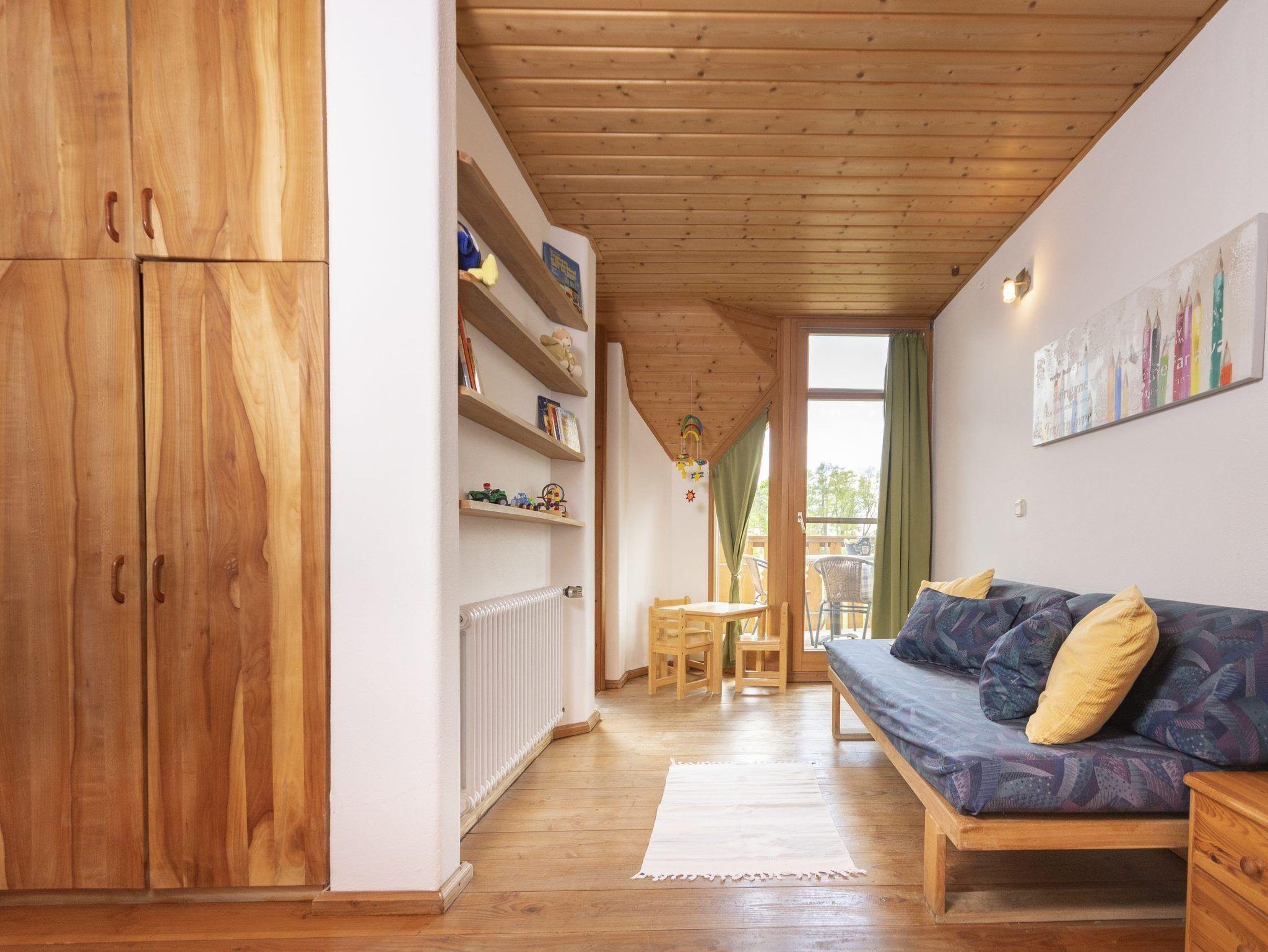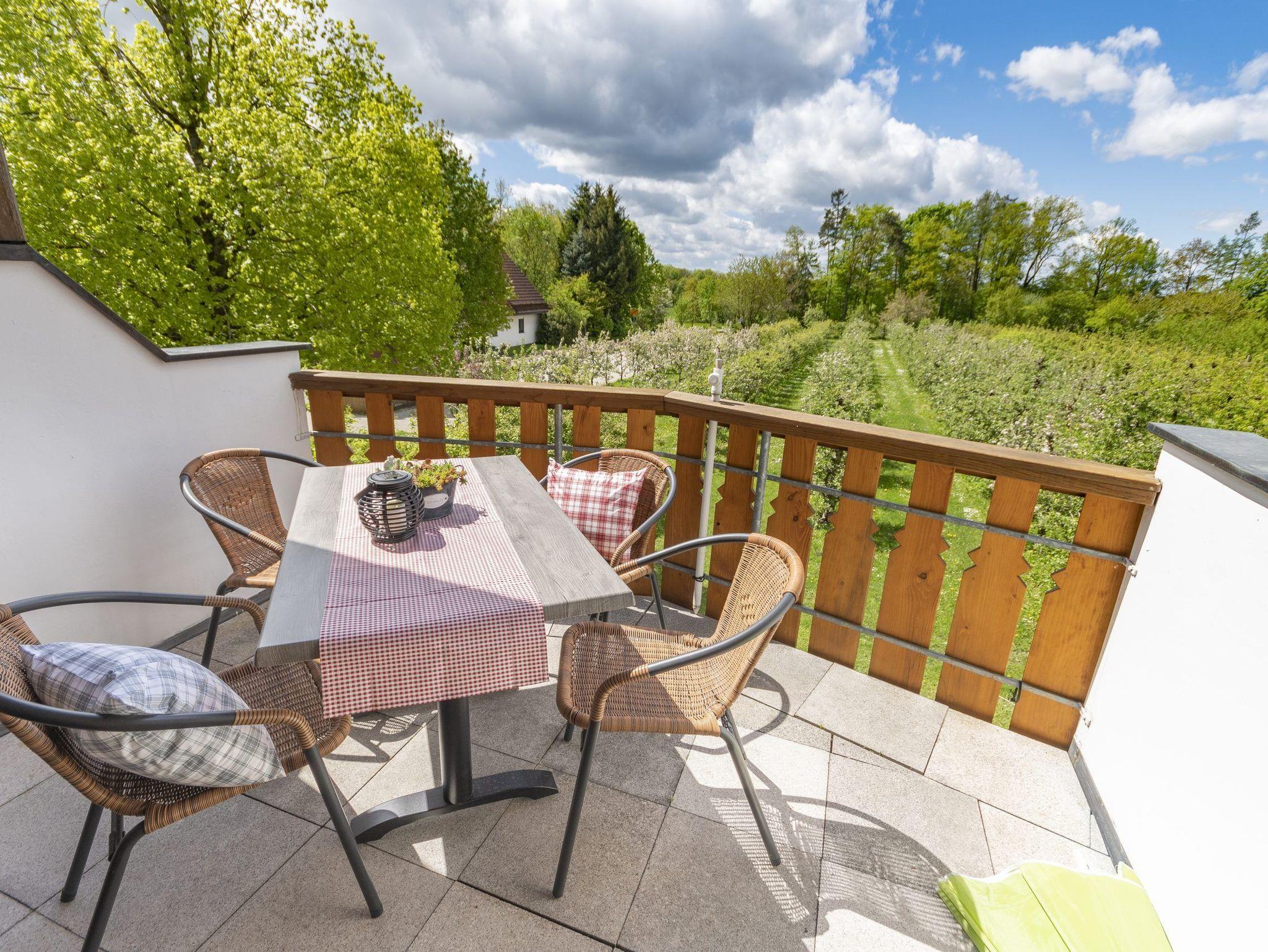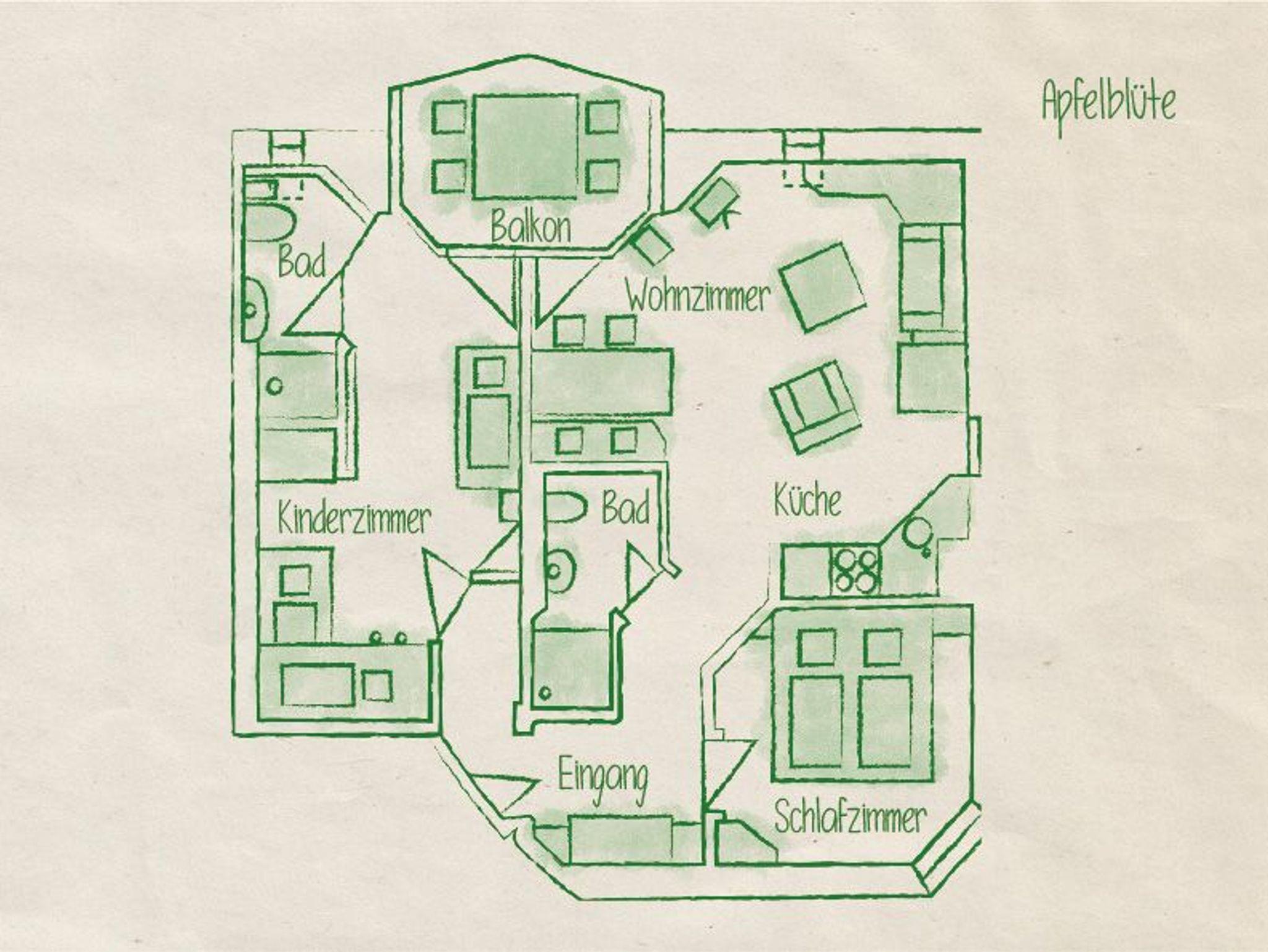 Unsere Ferienwohnung Apfelblüte befindet die im ersten Stock des Gästehauses und hat 2 Schlafzimmer (Elternschlafzimmer, Kinderzimmer), 2 Bäder mit Dusche und WC. Der Südbalkon bietet Ihnen einen traumhaftem Blick über unseren Obstgarten.