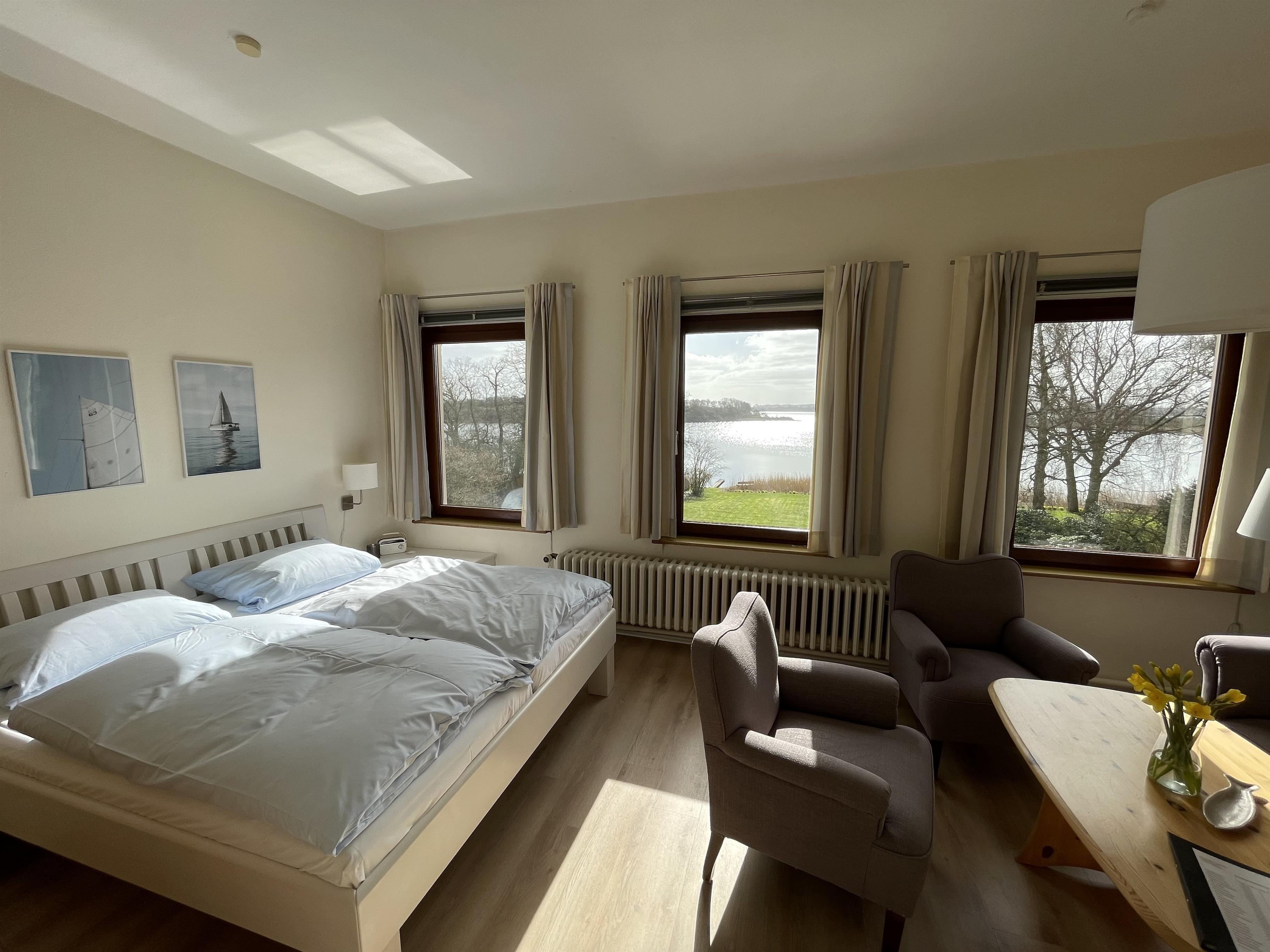 Gemütliche Ferienwohnung auf Bauernhof mit Schleiblick und eigenem Bootssteg für Wassersportliebhaber.
