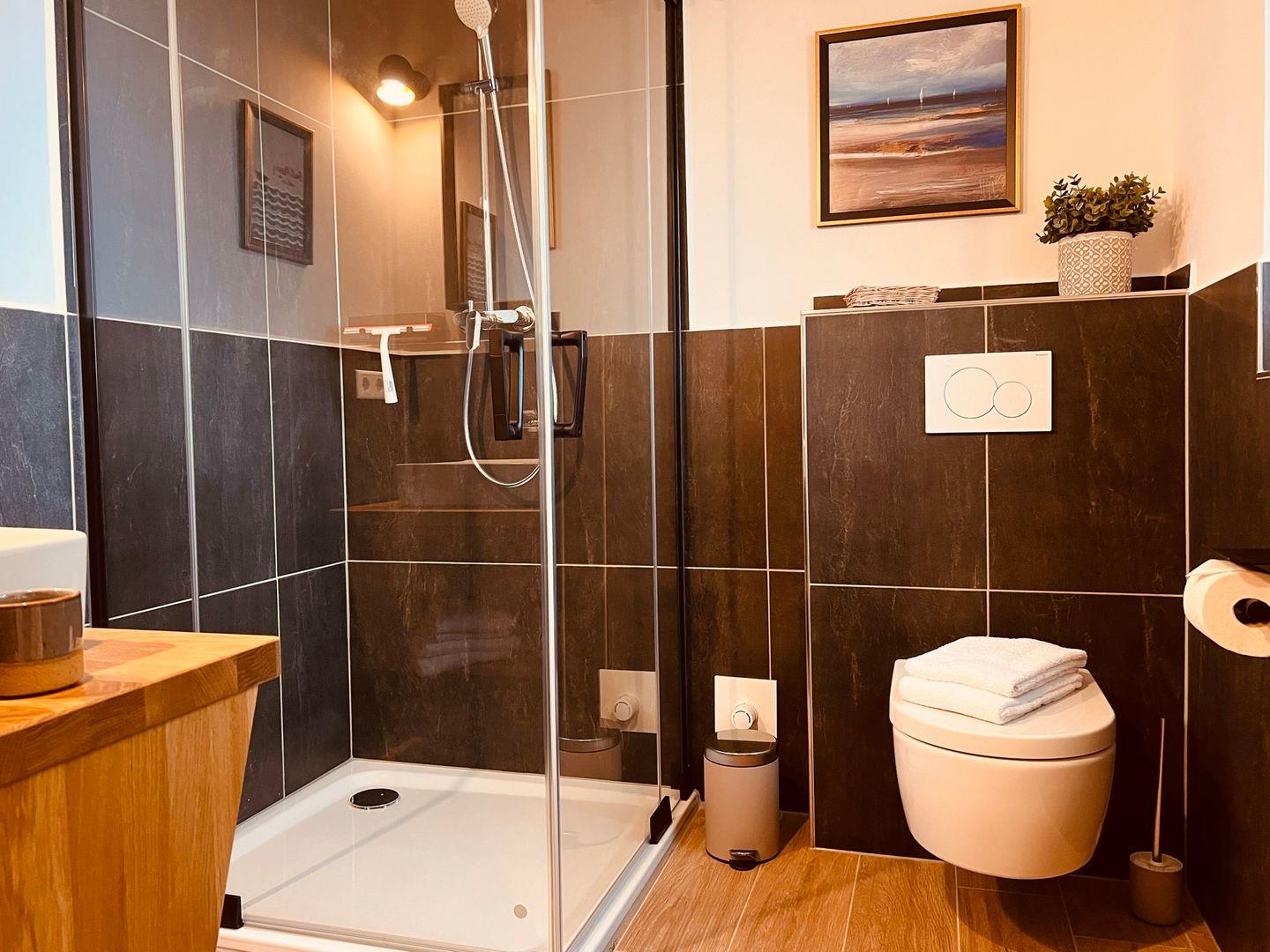 Das Schlafzimmer verfügt über ein komfortables Boxspringbett (180x200 cm) mit offenem Fußende und einem Kleiderschrank. Verdunklungsmöglichkeiten garantieren erholsame Nächte. Das Badezimmer ist modern gestaltet und bietet eine ebenerdige Dusche, WC, Haartrockner, Spiegel sowie Waschbecken und Fenster für frische Luft.