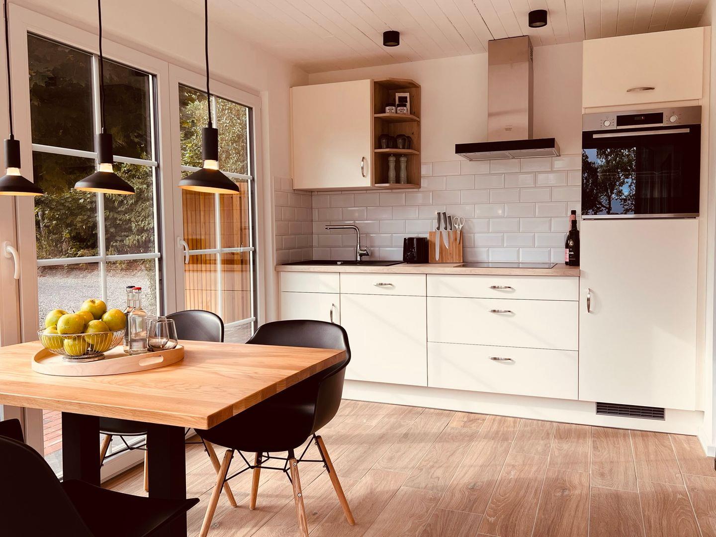 Der Essbereich geht nahtlos in die moderne Küche über, die mit einem Esstisch sowie hochwertigen Geräten wie einem Induktionskochfeld, Backofen, Kühlschrank mit Gefrierfach, Spülmaschine und einer Kapselmaschine (Nespresso) ausgestattet ist. Zusätzlich stehen Ihnen ein Wasserkocher, Toaster und Handrührgerät zur Verfügung, um Ihre kulinarischen Wünsche zu erfüllen.