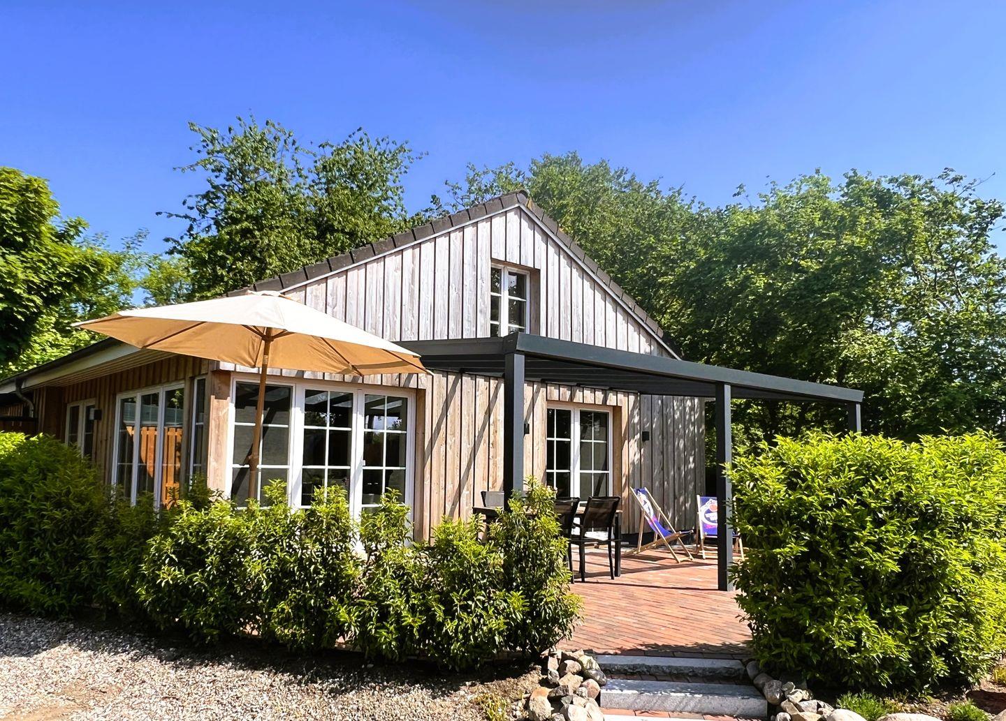Das Gartenhaus L – Sommerhaus 54 in Grödersby bietet modernen Komfort und Gemütlichkeit auf 50 m² mit Sauna und Terrasse.