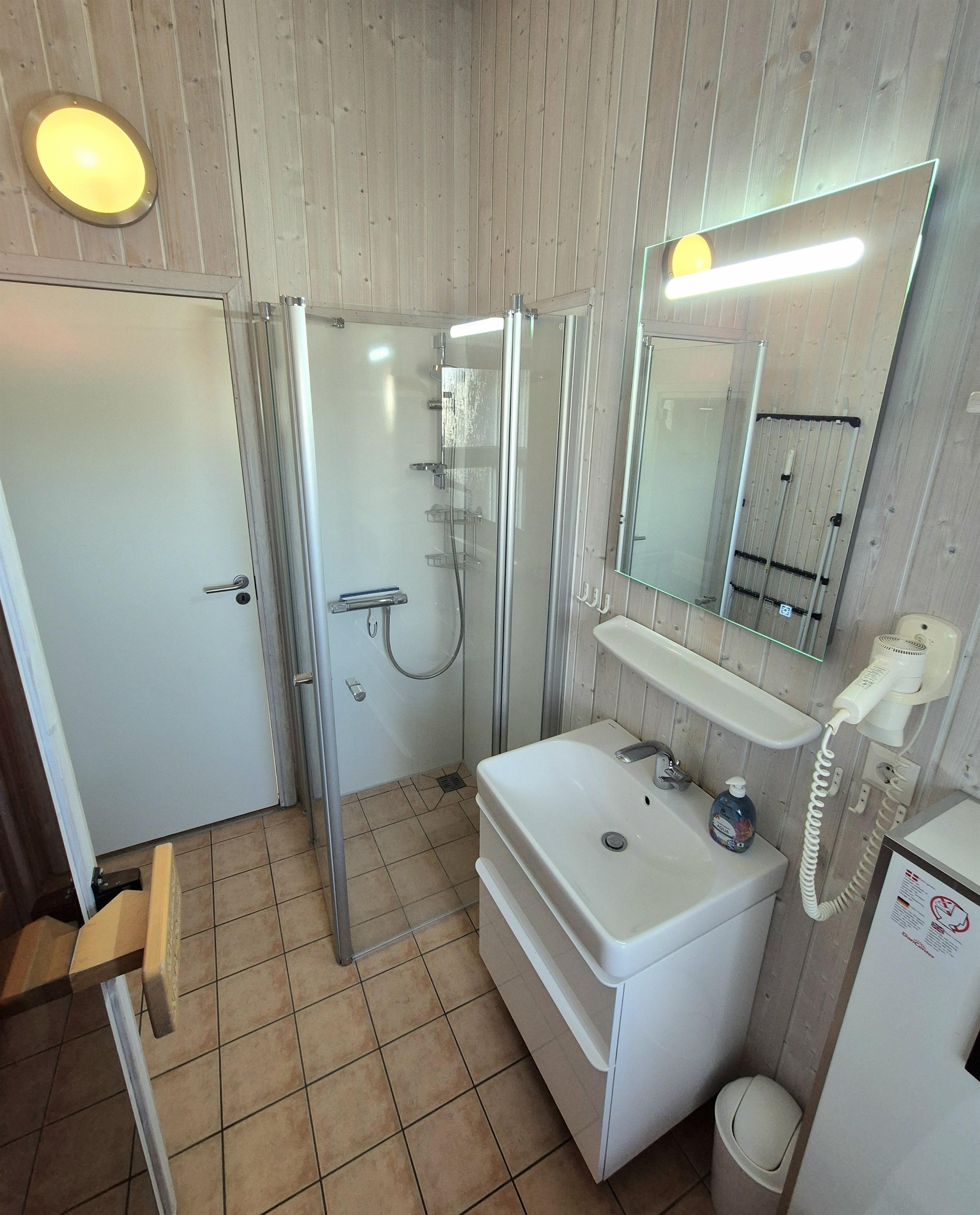 Im Badezimmer (mit Fußbodenheizung) erwartet Sie eine Dusche mit Glastrennwand und Thermostatarmatur sowie eine kleine Sauna.