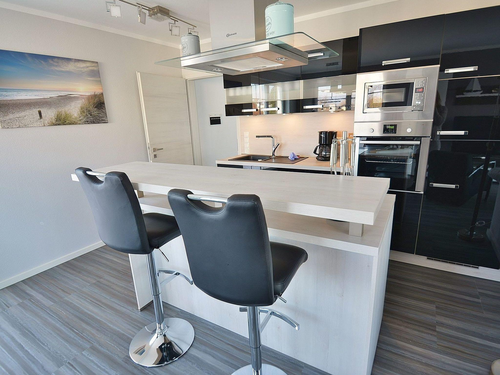 Die moderne hochwertige Küche ist im Wohnbereich integriert. Sie ist ausgestattet mit einem Kühlschrank mit Gefrierfach, einer Spülmaschine, einem Backofen und einer Mikrowelle. Des Weiteren stehen eine Kaffeemaschine, ein Toaster, ein Wasserkocher zur Verfügung.