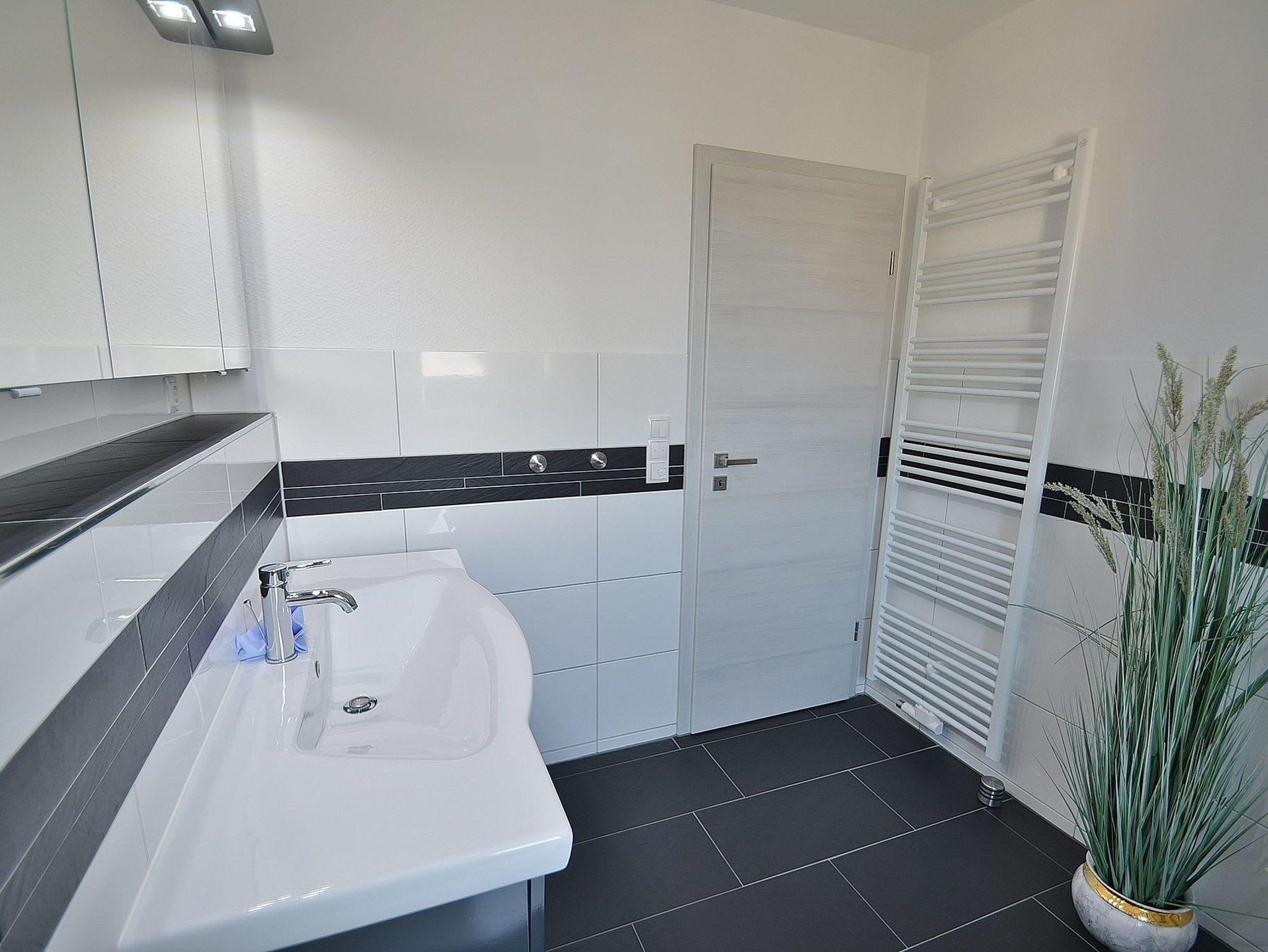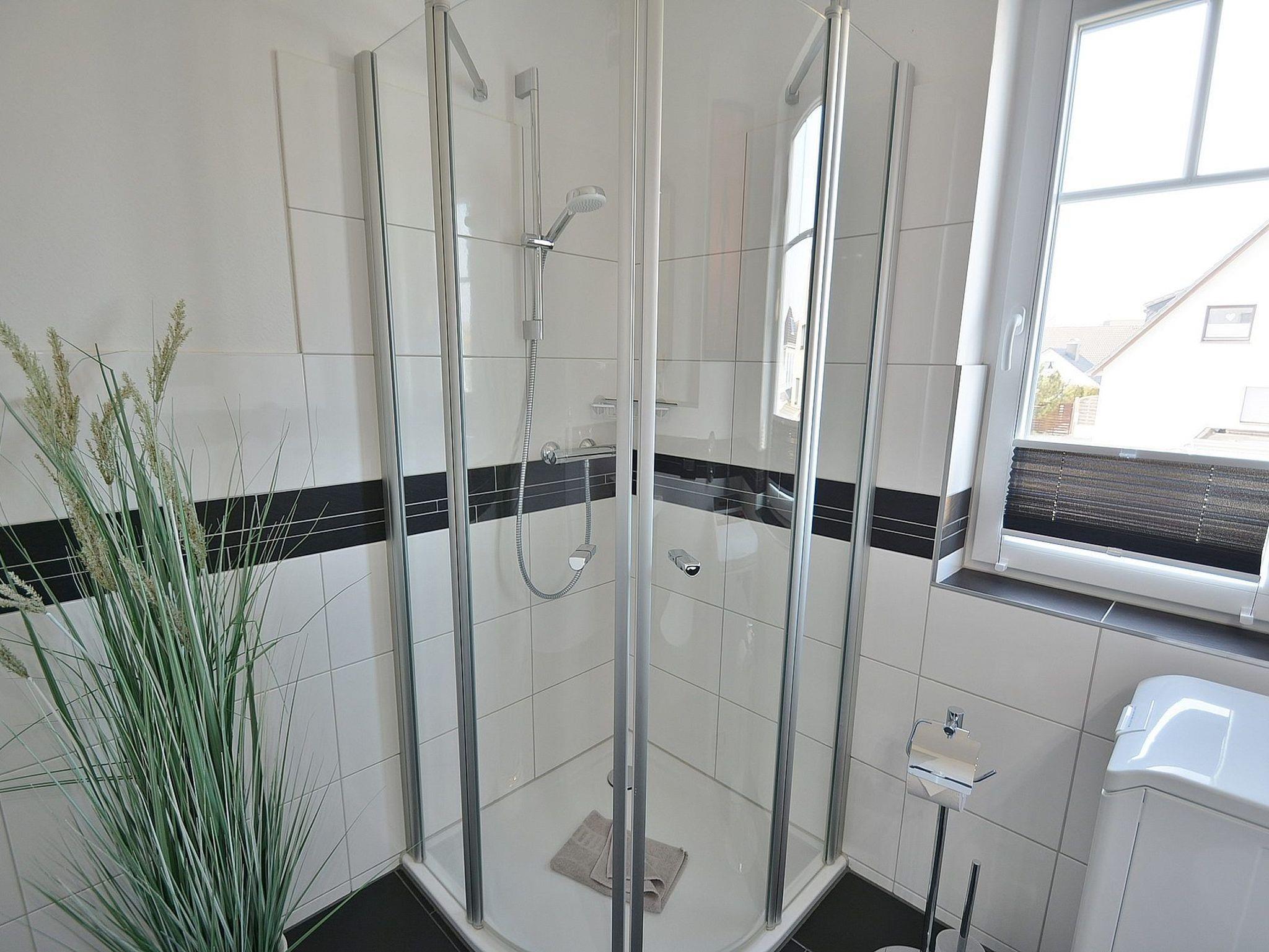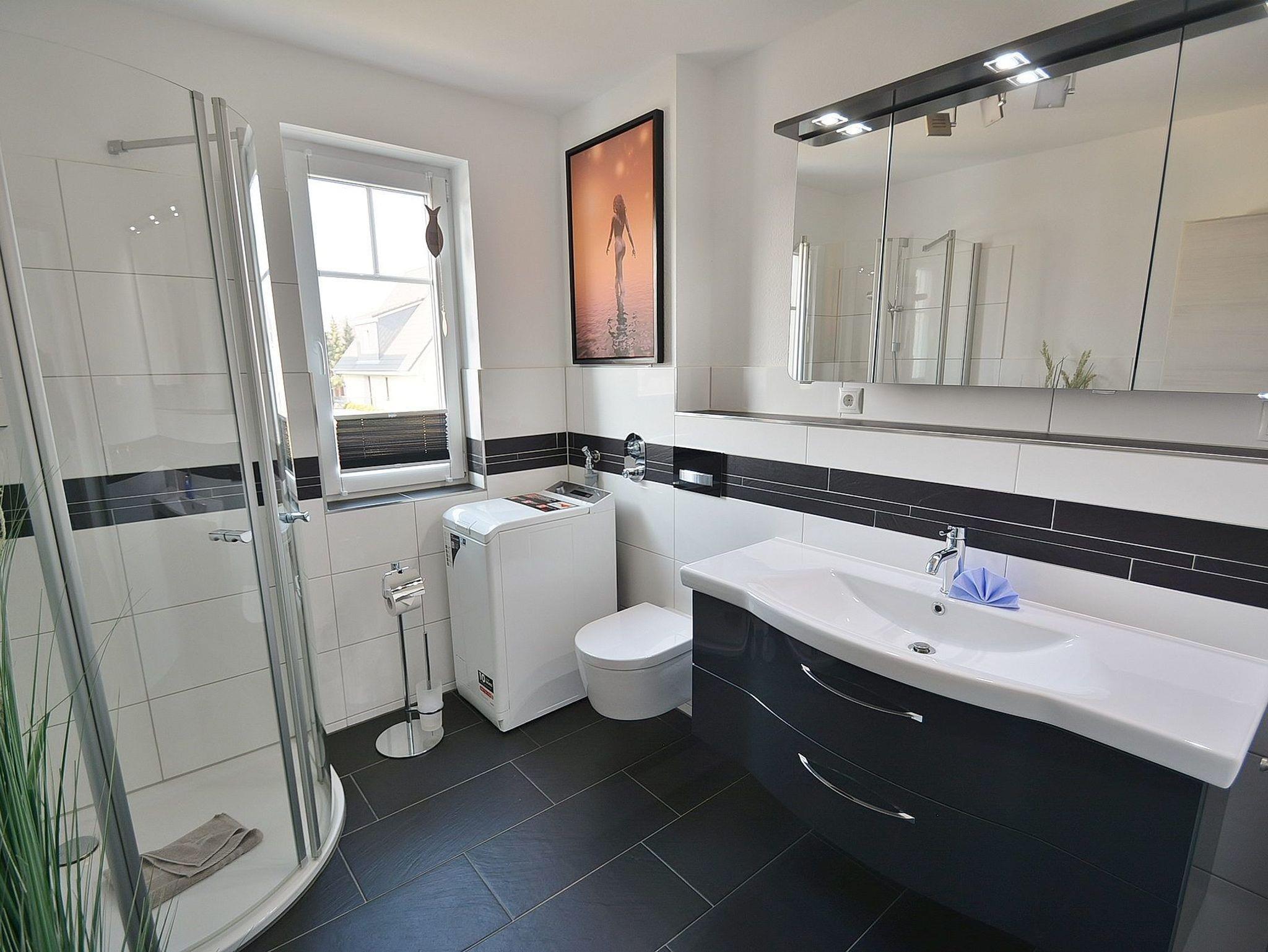 Modernes Tageslichtbad mit Dusche, Waschbecken und WC. Außerdem steht eine kleine Waschmaschine zur Verfügung.