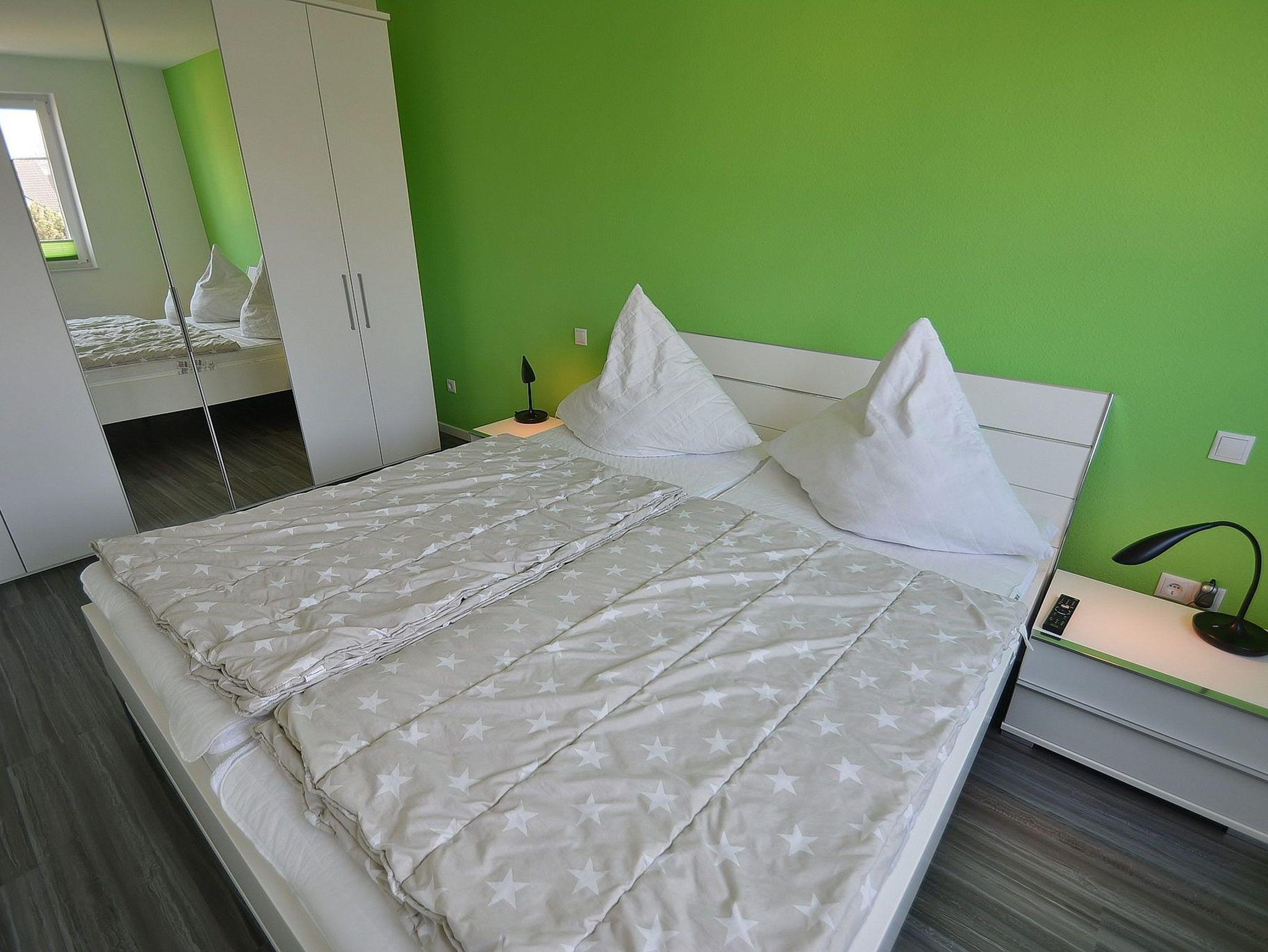 Das gemütliche Schlafzimmer ist mit einem Doppelbett und einem Kleiderschrank ausgestattet. Der Raum ist mit Designer-Planken ausgelegt und lässt sich mit einem elektrischen Außenrollladen verdunkeln. Eine Schlafcouch steht als weitere Schlafmöglichkeit im Flurbereich zur Verfügung. Auch der Flurbereich lässt sich mit einem Außenrollo verdunkeln.
