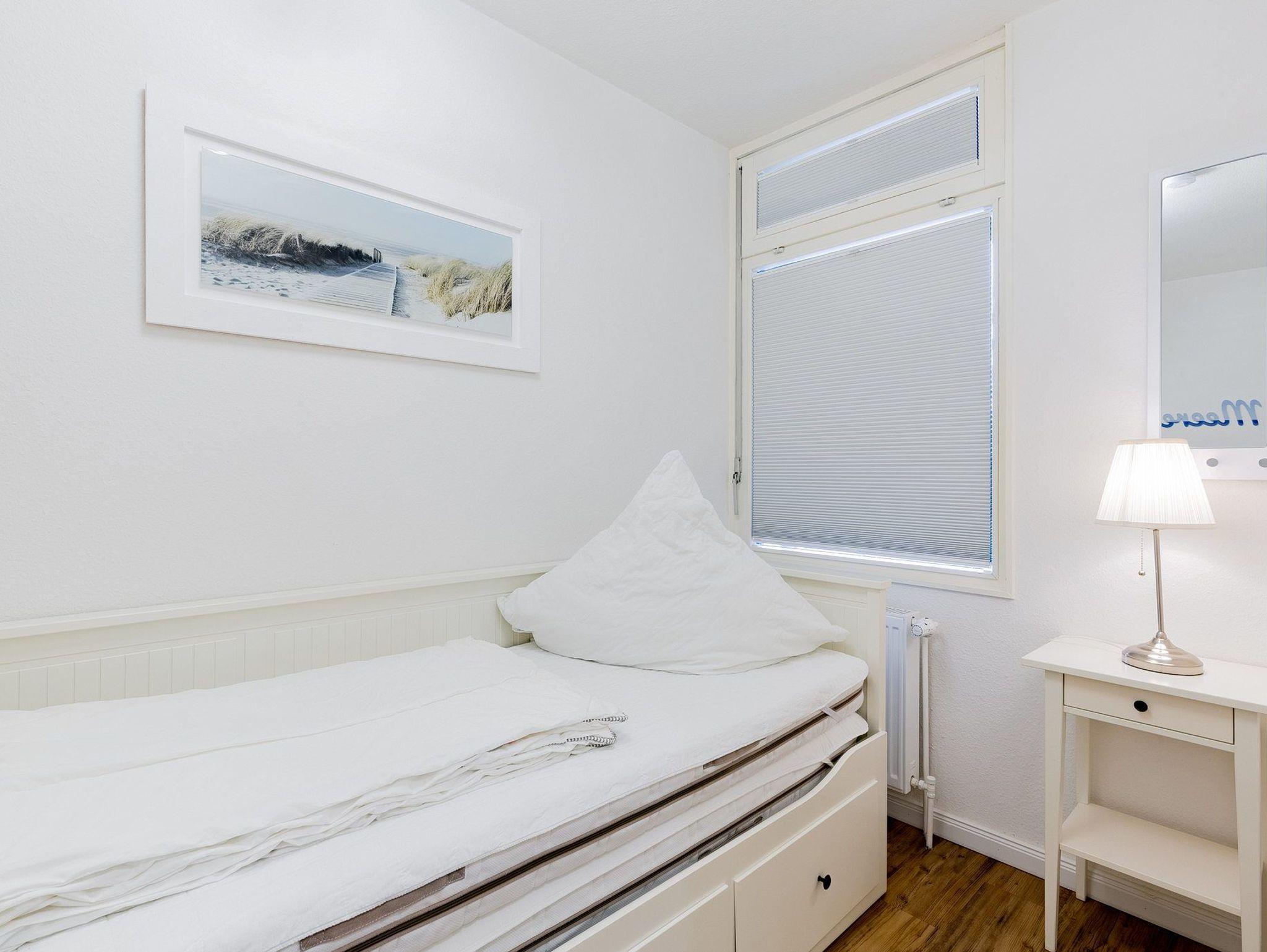 Im Kinderzimmer befindet sich ein ausziehbares Tandembett (jeweils 80x200cm) und eine moderne Kommode. Der Raum ist mit Designer-Planken ausgelegt und lässt sich durch ein Innenrollo verdunkeln.