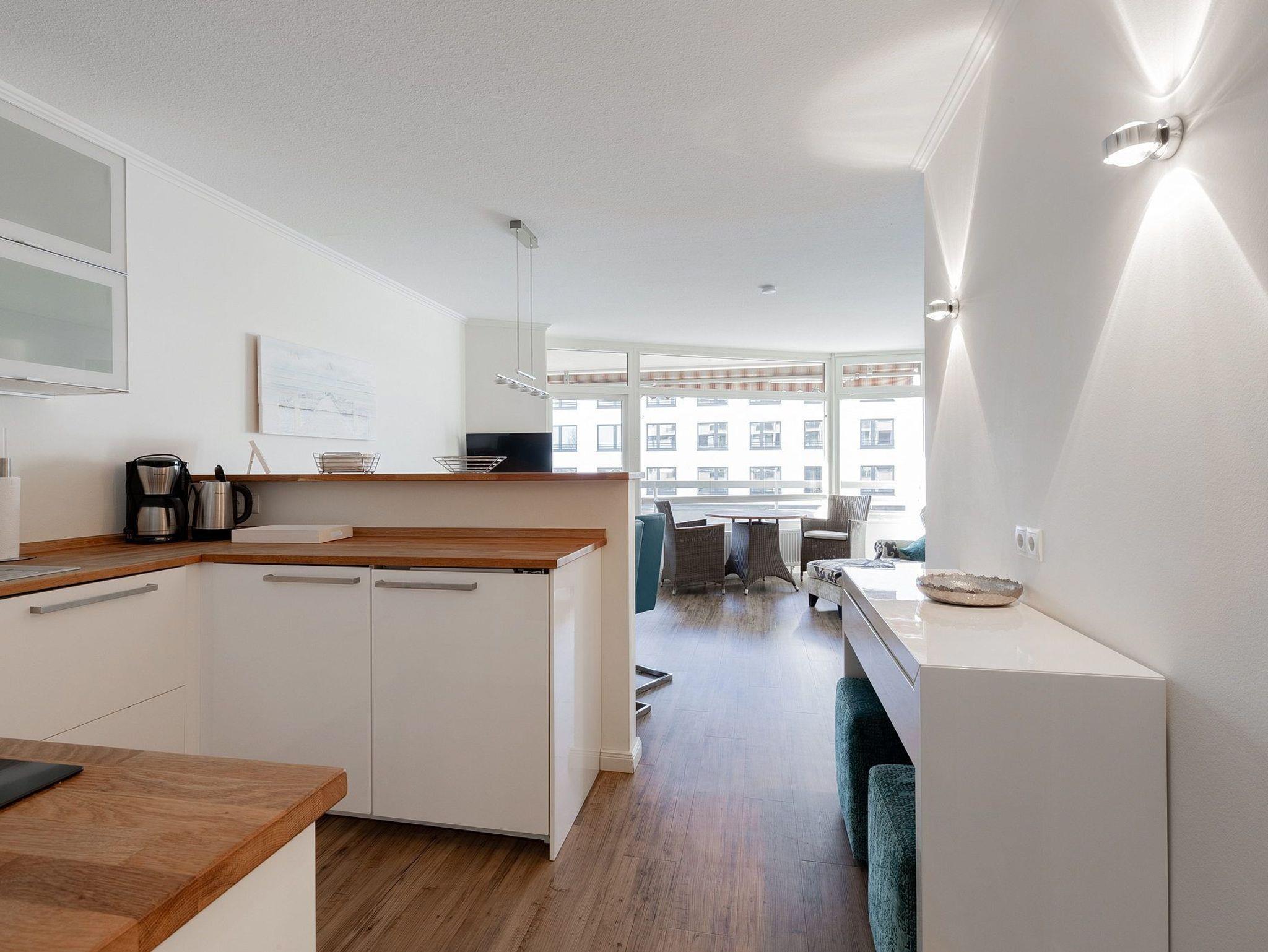 Die zum Wohnzimmer offen gestaltete Küche verfügt über einen 4-Platten Induktionsherd, einen Backofen, eine Spülmaschine und einen Kühlschrank mit 3-Sterne Gefrierfach. Des Weiteren ist die Küche mit einem Wasserkocher, einem Eierkocher, einem Toaster und einer Kaffeemaschine ausgestattet.