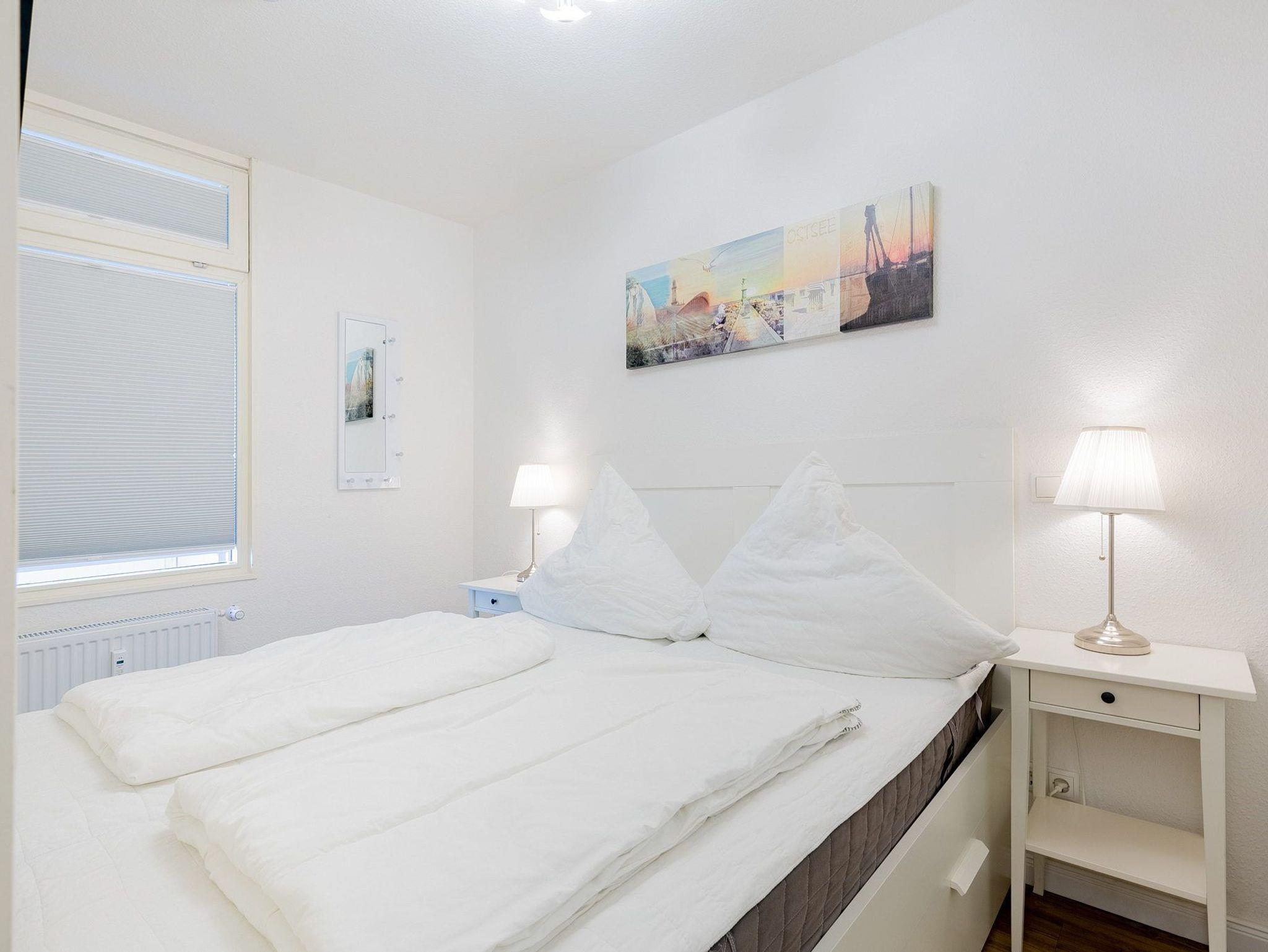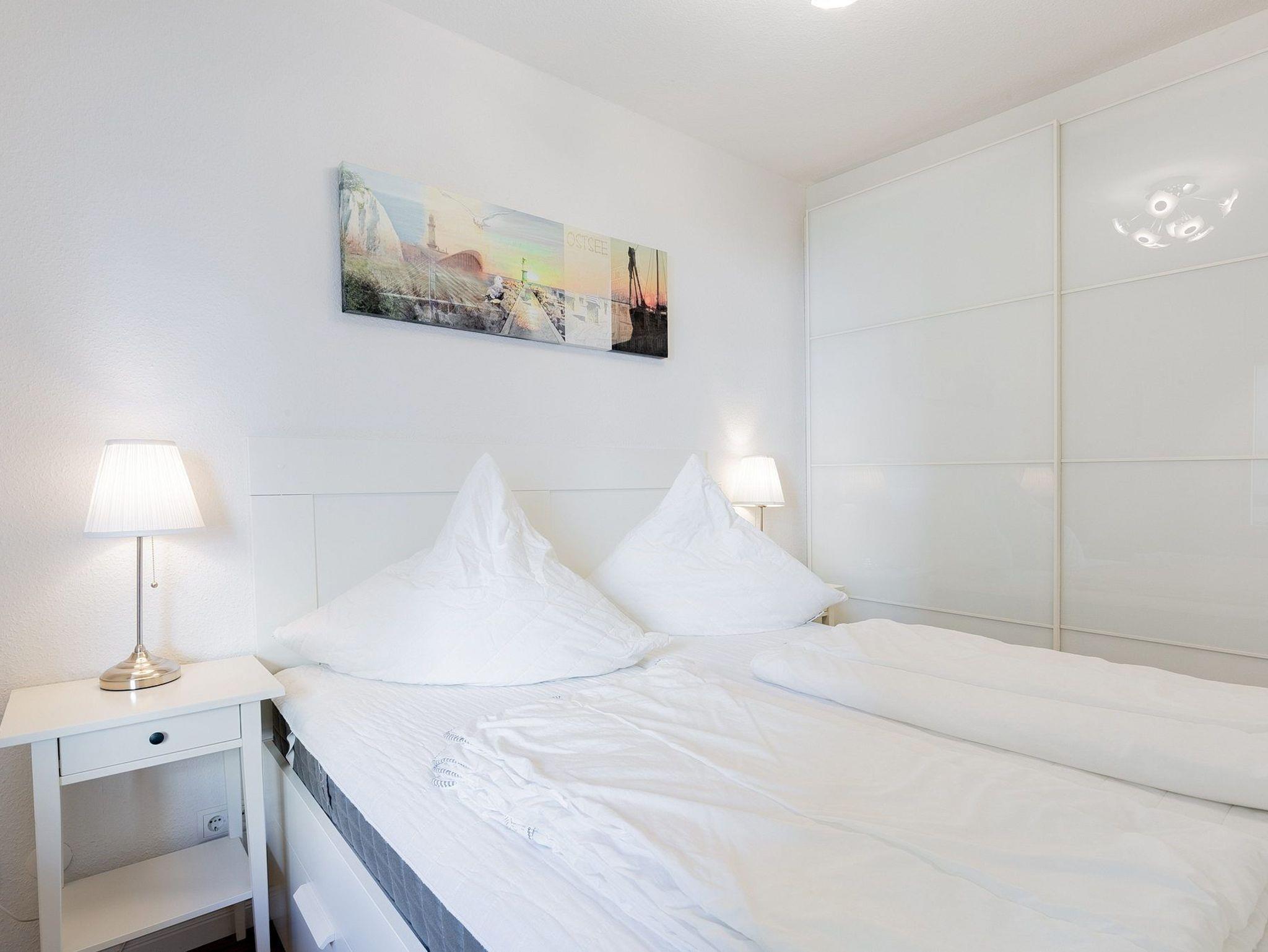 Das Schlafzimmer verfügt über ein Doppelbett (2x80x200cm) und einen Schiebetüren-Kleiderschrank mit Innenbeleuchtung. Der Raum ist mit Designer-Planken ausgelegt und lässt sich durch ein Innenrollo verdunkeln.