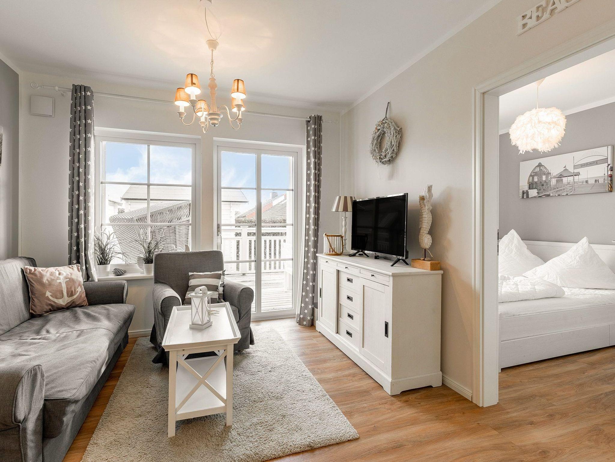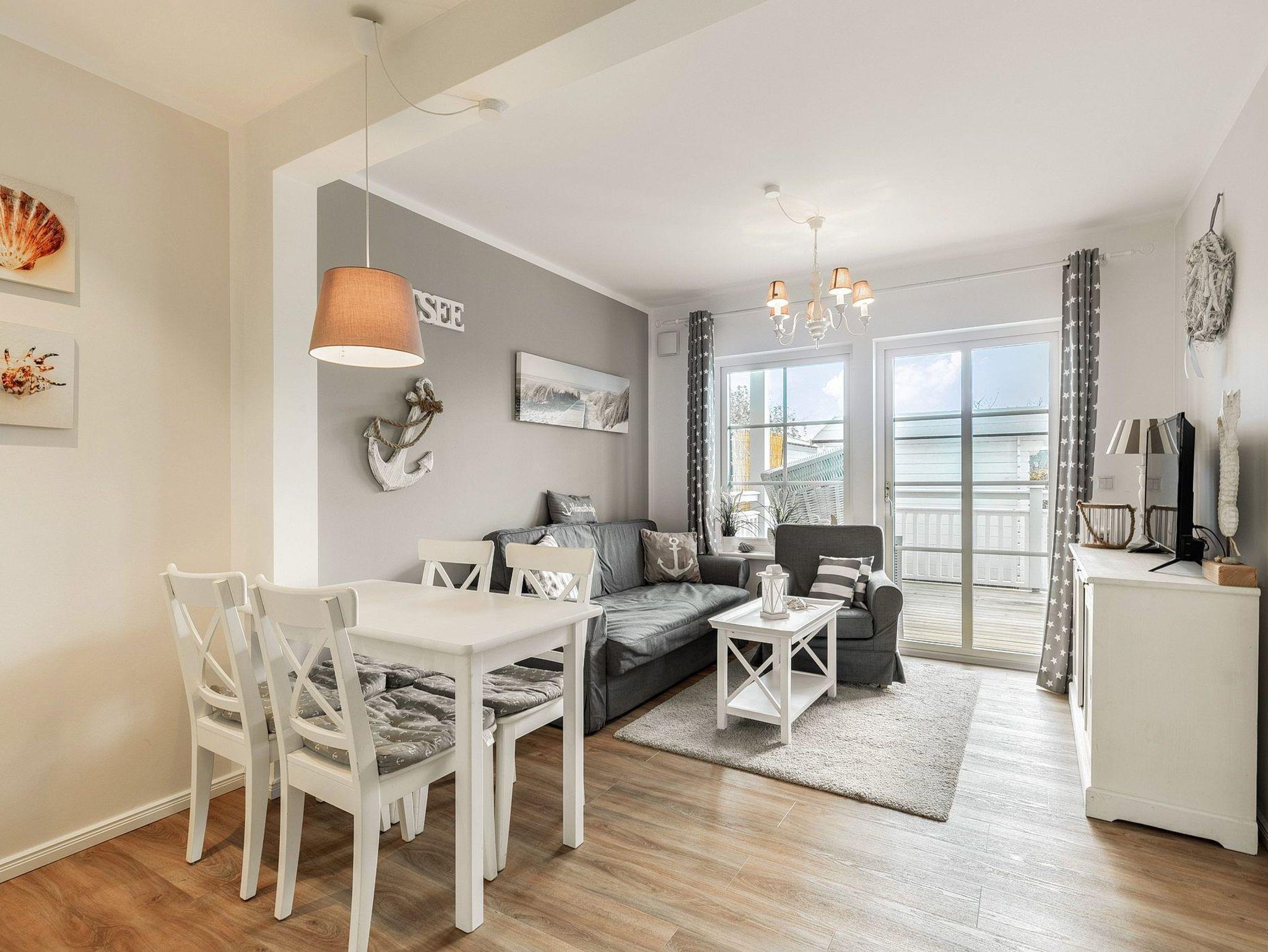 Modernes, geschmackvoll eingerichtetes Wohn- und Esszimmer mit Terrassenzugang. Das Wohn- und Esszimmer ist mit einem Sofa, einem Sessel, einer Kommode und einem Essplatz für 4 Personen ausgestattet. Das Zimmer ist mit Vinylboden ausgelegt. Zur Unterhaltung steht ein Sat-Fernseher zur Verfügung.