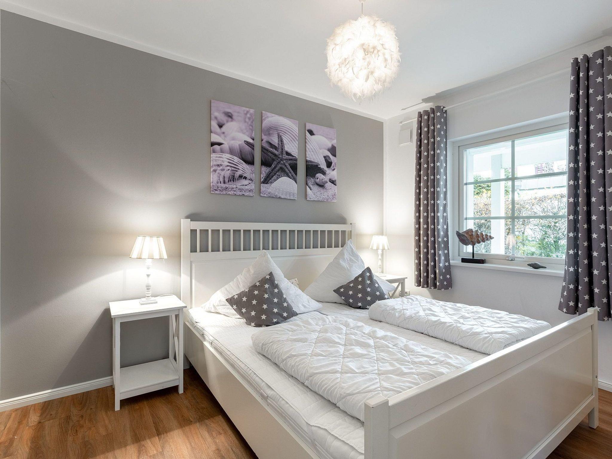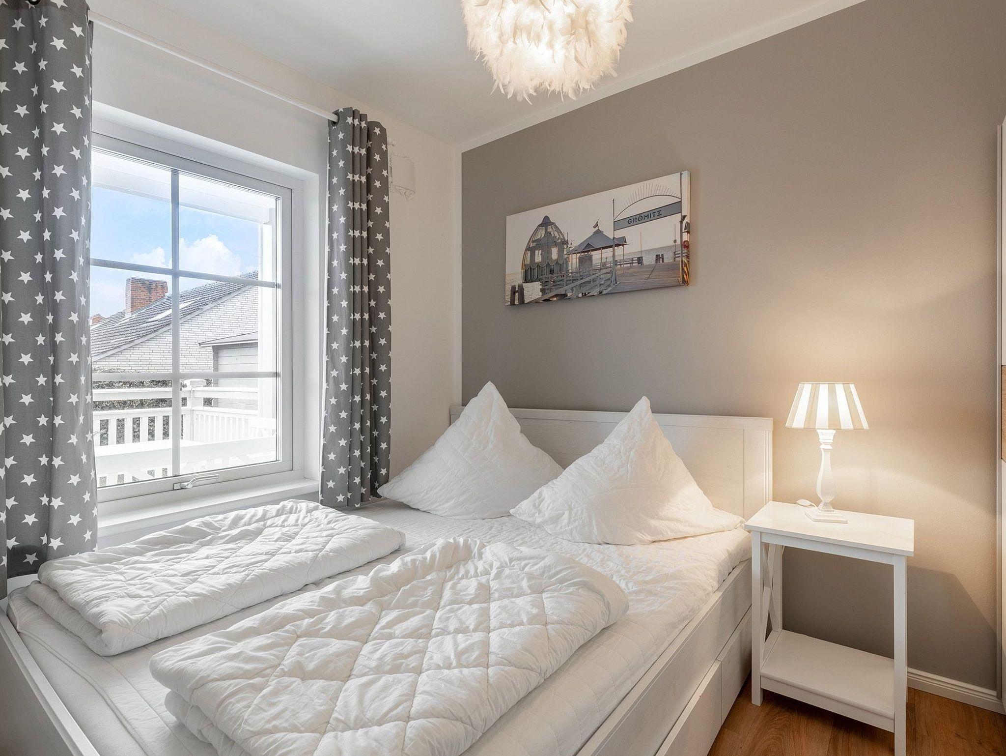 Separates, modern eingerichtetes Schlafzimmer mit Doppelbett (140x200cm), einem Nachttisch und einem Kleiderschrank. Das Schlafzimmer ist mit Vinylboden ausgelegt. Das Fenster zur Terrasse lässt sich durch einen Vorhang etwas verdunkeln.