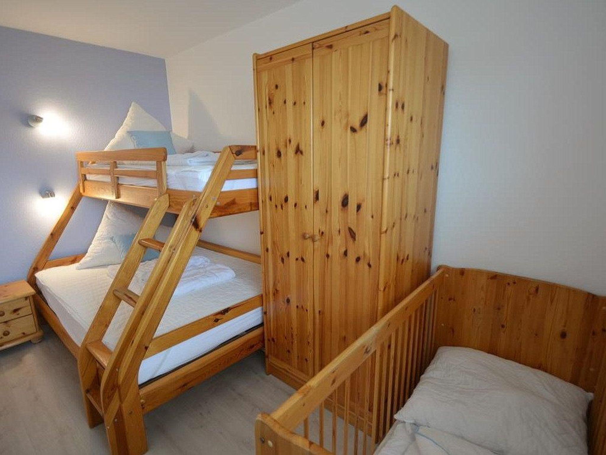 Das Kinderzimmer verfügt über ein Etagenbett (oben: 90x200cm, unten: 140x200cm), ein Kinderbettchen sowie einen 2-türigen Kleiderschrank. Der Raum ist mit Designerplanken ausgelegt und lässt sich durch Außenrollläden vollständig verdunkeln.