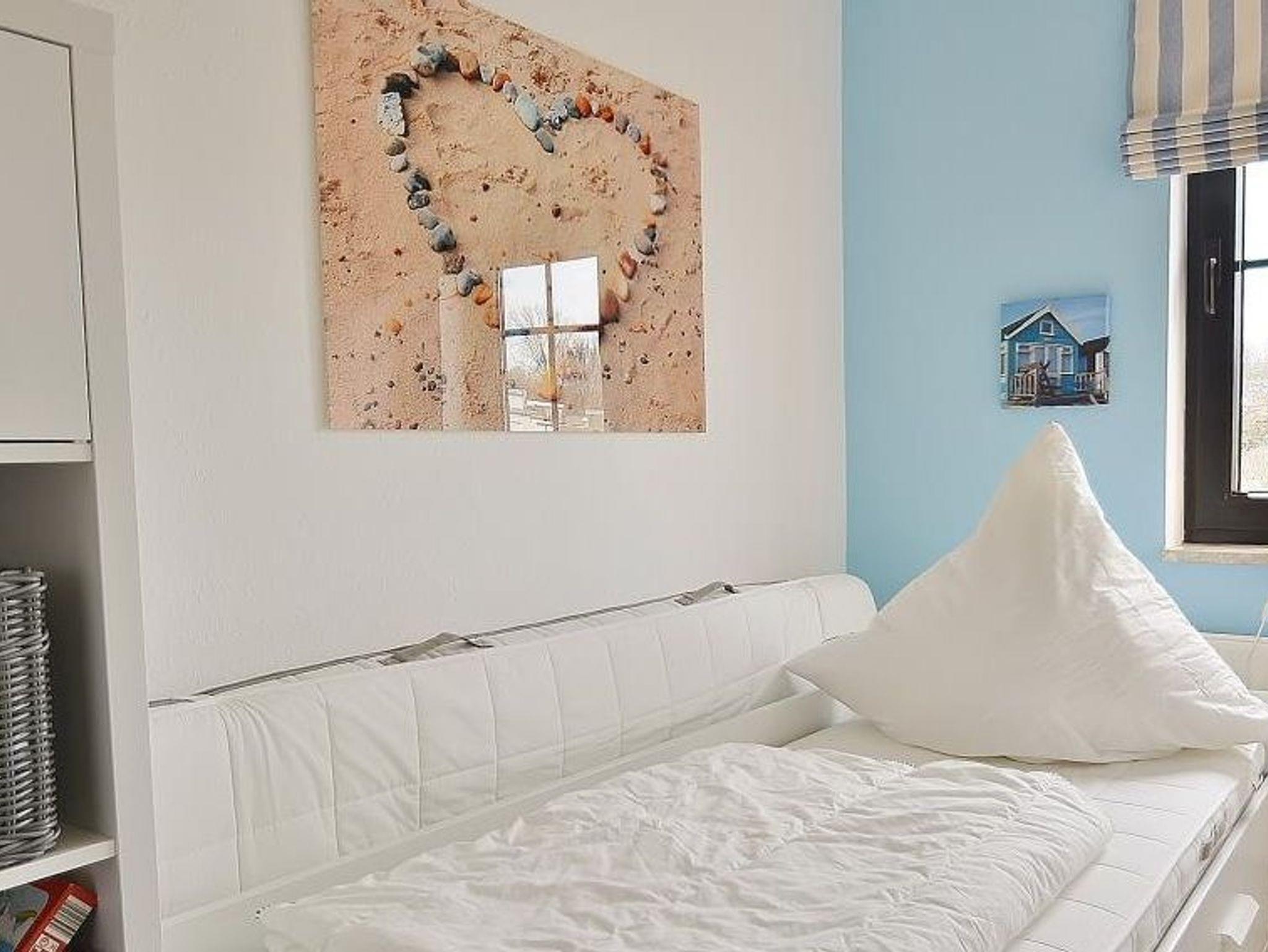 Das Kinderzimmer verfügt über ein ausziehbares Doppelbett (2x80x200cm). Der Raum ist mit Laminatboden ausgelegt, das Fenster lässt sich durch ein Plissee verdunkeln.