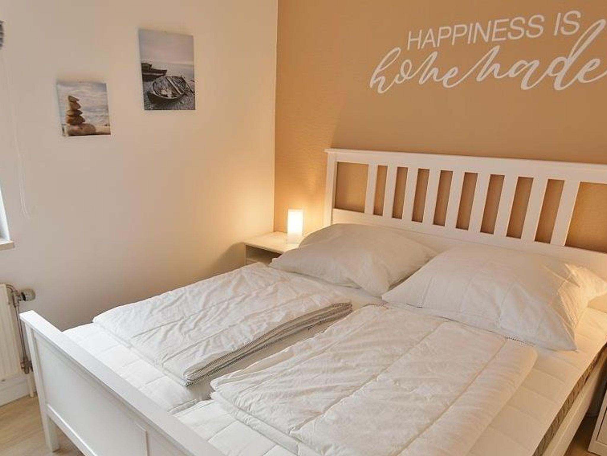 Das helle freundliche Schlafzimmer verfügt über ein Doppelbett (2x80x200cm) und einen Kleiderschrank. Der Raum ist mit Laminat ausgelegt, die Fenster lassen sich durch ein Plissee verdunkeln.